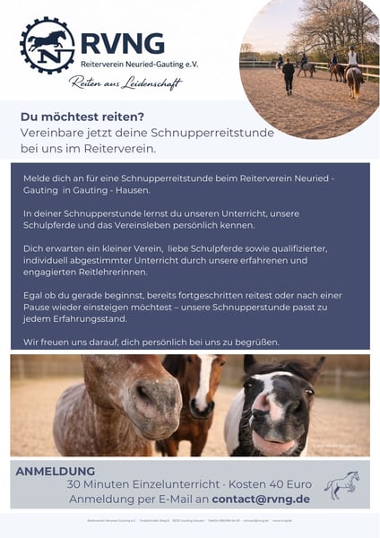 Du möchtest reiten? Vereinbare jetzt deine Schnupperreitstunde bei uns im Reiterverein. Melde dich an für eine Schnupperreitstunde beim Reiterverein Neuried - Gauting in Gauting - Hausen. In deiner Schnupperstunde lernst du unseren Unterricht, unsere Schulpferde und das Vereinsleben persönlich kennen. Dich erwarten ein kleiner Verein, liebe Schulpferde sowie qualifizierter, individuell abgestimmter Unterricht durch unsere erfahrenen und engagierten Reitlehrerinnen. Egal ob du gerade beginnst, bereits fortgeschritten reitest oder nach einer Pause wieder einsteigen möchtest - unsere Schnupperstunde passt zu jedem Erfahrungsstand. Wir freuen uns darauf, dich persönlich bei uns zu begrüßen. Foto, Nicola Friedrich REITUNTERRICHT AB 10 JAHREN - SCHNUPPERSTUNDE 30 Minuten Einzelunterricht • Kosten 40 Euro Anmeldung per E-Mail an contact@rvng.de