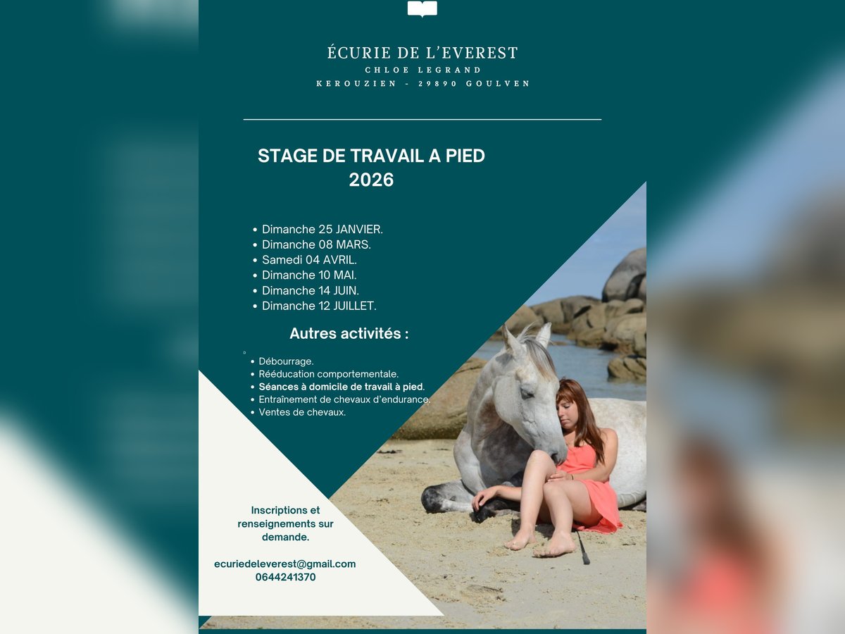 Planning 2026 : Muni d'un diplôme en iet science équine je propose des places pour des séances à domicile : • Éducation du poulain / jeune cheval. • Gestion des émotions du cheval. • Travail sur les respect. • Améliorer la relation. • Travail en liberté. • Travail sur les figures (couché, pas espagnol...). Rééducation comportemental : • Cheval qui ne se laisse pas attraper au champs. • Peur de la tondeuse. • Rétif en extérieur. • Cheval qui arrache la longe • Et bien d'autres problèmatiques. Les inscriptions aux stages sont ouvertes. D'autres créneaux sont possible pour des stages dans votre écurie.