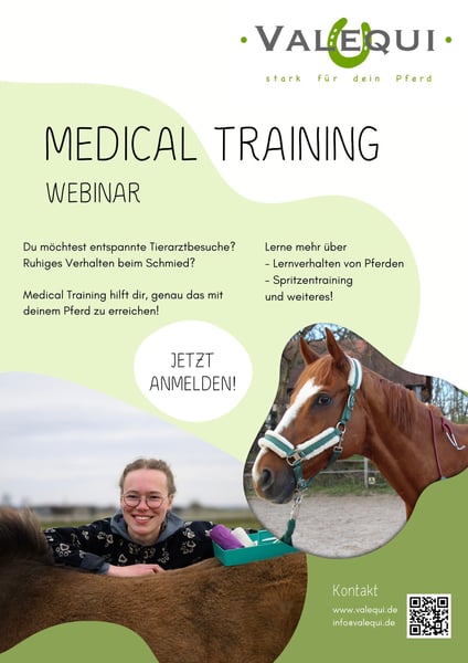 Hallo, ich bin Nicole - Pferdewissenschaftlerin und Tiermedizinstudentin - und möchte dich und dein Pferd bestmöglichst unterstützen! Du findest bei mir Seminare, Workshops und Trainings rund um Pferdegesundheit im Raum Nürnberg/Erlangen/Fürth. Aktuell: Medical Training 💉🐴 Webinar am 03.01. und 13.02.2026 🐎 Du lernst u.a.: - wie Pferde lernen - wie du mit Medical Training beginnst - wie du dein Pferd auf die nächste Impfung vorbereitest - wie du Stressanzeichen erkennst 📚 Dabei setze ich auf verschiedene Lernmethoden und eine enge Verknüpfung von Theorie und Praxis. 📆 Sichere dir jetzt einen Platz im Webinar am 03.01. und 13.02.2026! Weitere Informationen und Anmeldung auch unter www.valequi.de | info@valequi.de