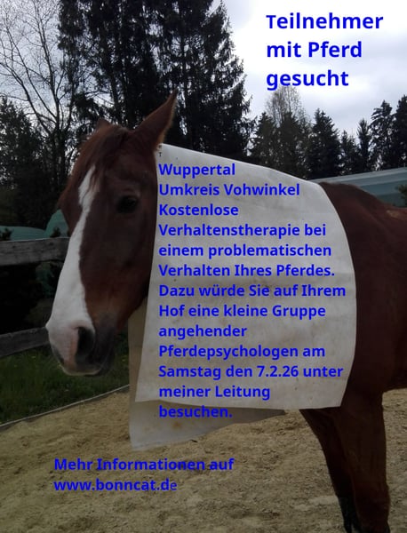 Für Samstag, den 7.2. suche ich für meine angehenden Pferdeverhaltenstherapeuten Teilnehmer für eine kostenlose Beratung. Es sollte im Raum Wuppertal/Vohwinkel sein, so dass wir Euch im Stall besuchen können. Wenn Ihr also eine Unstimmigkeit oder sogar ein problematischen Verhalten im Handling mit Eurem Pferd habt, meldet Euch gerne bei mir: info@bonncat.de Auch für weitere Infos, entweder auf meine Homepage schauen oder direkt Kontakt mit mir aufnehmen und einfach fragen. Ich würde mich sehr freuen.