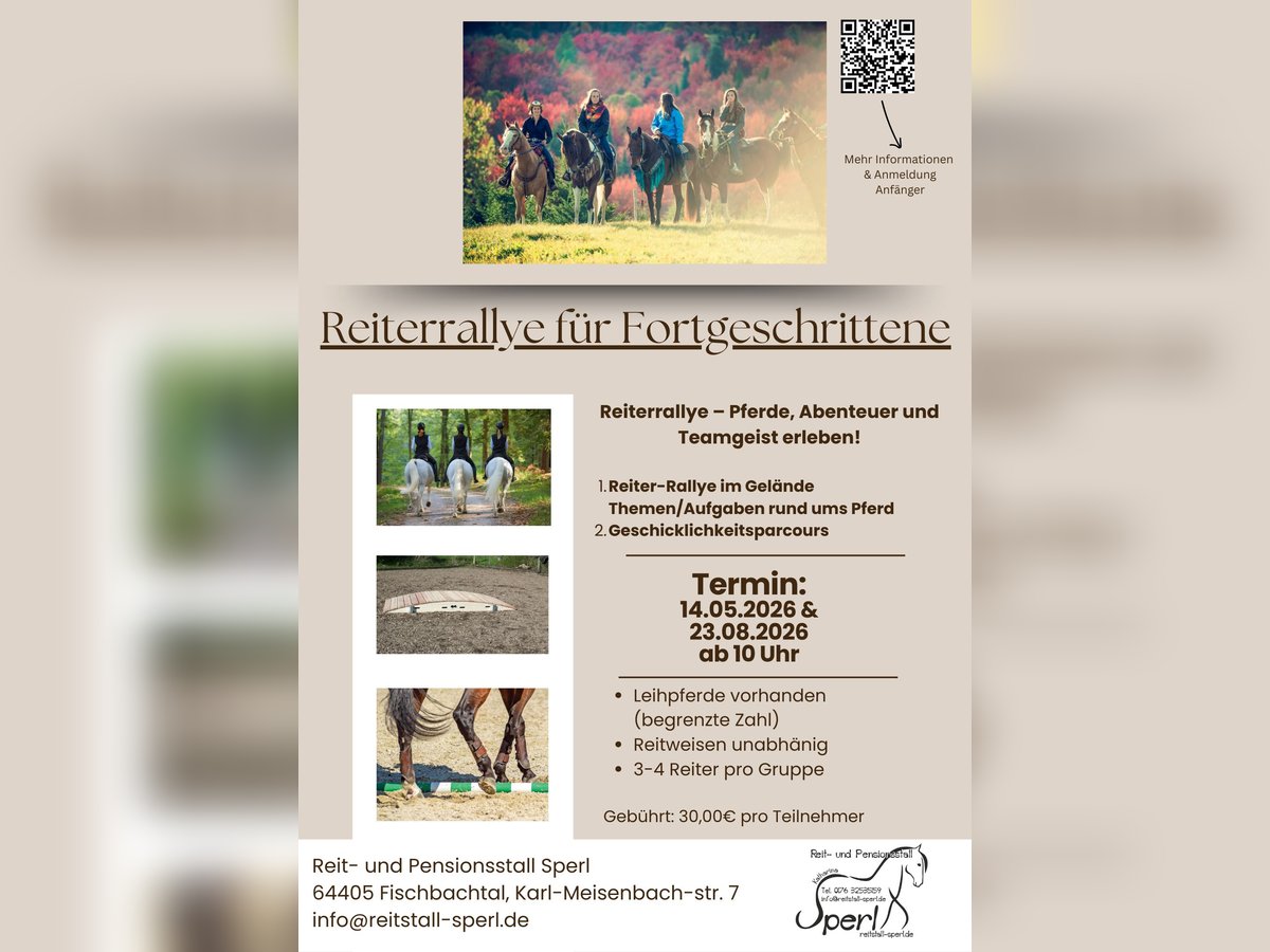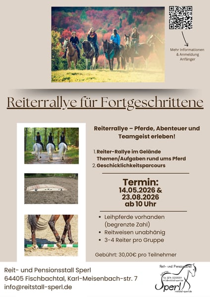Termine: 14.05.2026 10:00-15:30 Uhr Buchung: https://reitstall-sperl.reitbuch.com/course.php?c=54 - keine Leihpferde mehr verfügbar 23.08.26 10:00-15:30 Uhr Buchung: https://reitstall-sperl.reitbuch.com/course.php?c=56 - noch 5 Leihpferde verfügbar Unser Programm Reiter-Rallye im Gelände Themen/Aufgaben rund ums Pferd Geschicklichkeitsparcours Siegerehrung Buchung über unser Reitbuch oder über das untenstehende Kontaktformular Wer Teamspirit liebt und sportlichen Ehrgeiz besitzt, erlebt bei unserer Reiter-Rallye Spannung & Spass auf dem Pferderücken. In 3.4er Teams bewältigst du mit deinem eigenen Pferd oder einem Leihpferd spannende Aufgaben im Gelände & Absolvierst einen Geschicklichkeitsparcours. Das Team mit den meisten Punkten gewinnt und erhält bei der Siegerehrung eine Medaille. Anmelden kannst du dich als Einzelperson (Team / Partner wird zugeteilt) oder als Team. Jeder Teilnehmer erhält eine Schleife für den Gelände Teil. Die Sieger zusätzlich noch Medallien. Gebühren: Grundgebühr: 30,00€ ggf. plus Leihpferd +20,00€ *es stehen max. 6 Leihpferde zur Verfügung. Voraussetzungen: Sicher in Schritt, Trab und Galopp ***Unter 18 Jährige benötigen einen Erwachsenen Team Partner und die Einversändnis eines Erziehungsberechtigten*** Anzahl Teilnehmende: 15-24 Möglicher Ablauf Rallye (wird vorher genau zugesandt) **Jedes Team wird im 20 Minuten Takt los geschickt auf die Geländestrecke die ca 1,5 Stunden dauert** Gruppe 1 10:00-11:30 Gruppe 2 10:20-11:50 Gruppe 3 10:40-12:10 Gruppe 4 11:00-12:30 Gruppe 5 11:20-12:50 Gruppe 6 11:40-13:10 Jedes Team macht direkt nach seiner Ankunft von dem Gelände-Teil (Kleine Trinkpause kann natürlich gemacht werden) den Pacours in der Reithalle (Dauer max 5-10 Minuten). Im Anschluss hat jeder noch genug Zeit sein Pferd vor der Sieherehrung wieder zu "entlassen" 15:00 Uhr Siegerehrung