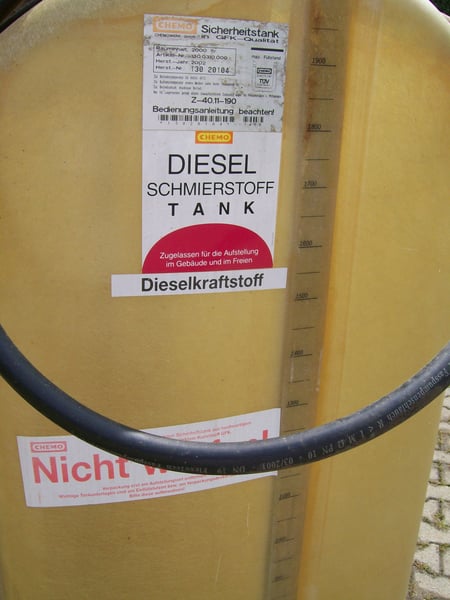Chemo Sicherheitstank GFK 2000 Liter für Diesel Elektropumpe HORNET W50 Set mit Automatik-Zapfventil Horn Dieselpumpe, Zählwerk Förderleistung: 55 l/min. Spannung: 230 V Abmessungen Tank 2050 X 700 x 1570 Mit Tankstelle ( Pumpe und Zähler ) 2250 hoch Tank war immer im trockenen und lichtgeschützt Doppelwand, keine Beschädigungen