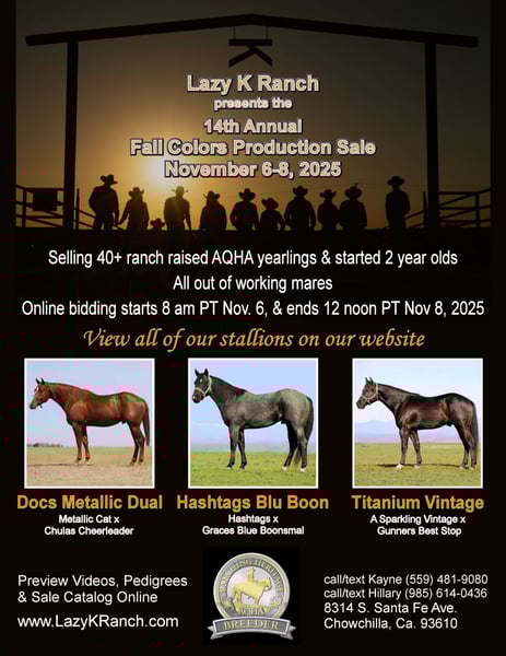 AQHA Ranching Heritage Breeder Selling 60+ American Quarter horses and Paints annually, out of the largest rermuda of working AQHA mares on the West Coast. All horses are born and raised on the ranch and offered for sale in November and May. Starts – Thursday, November 6, 2025, at 8:00 AM ET and Saturday, November 8, 2025, PT 8314 S. Santa Fe Ave., Chowchilla, CA 93610 VIEW CATALOG https://www.lazykranch.com/dc/pickacolt.html Contact: Kayne Billings 559-481-9080 sherry@lazykranch.com