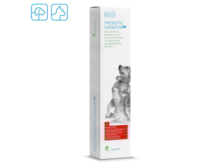 Prebiotic Topinpur Pet Rein natürliches Einzelfutter für Hunde und Katzen zur Stabilisierung der physiologischen Darmflora. Ideal nach Wurmkuren oder Antibiotikatherapien. Von Tierärzten empfohlen. Prebiotic Topinpur Pet von Valetumed ist ein reines, hochwirksames Konzentrat aus der Topinamburknolle. Das in Topinambur reichlich enthaltene Inulin soll die Darmflora stabilisieren und die körpereigenen Abwehrkräfte wirkungsvoll aktivieren, sowie das Immunsystem im Darm stimulieren. Prebiotic Topinpur schafft eine selektive Nahrungsgrundlage für positiv wirkende Darmbakterien. So reichern sich Mikroorganismen mit einem gesundheitsfördernden Einfluss im Dickdarm an und schädlichen Mikroorganismen wird weniger Raum geboten. Dadurch wird die Nährstoff- und Energieverwertung erheblich verbessert, toxische Stoff- wechselprodukte werden reduziert und die Immunität gestärkt. Der Leberstoffwechsel wird entlastet und die Rekonvaleszenz in Genesungsphasen unterstützt. Besonders empfohlen wird die Verabreichung von Topinpur nach Wurmkuren oder einer Antibiotikatherapie. Hochwirksames Konzentrat aus der Topinamburknolle Zur Stabilisierung der Darmflora von Hunden und Katzen Empfohlen nach Wurmkuren oder Antibiotikatherapien Verbesserung der Nährstoffresorption Wirkungsvolle Aktivierung der körpereigenen Abwehrkräfte Fütterungsempfehlung: Hunde je 10 kg: 1 ml täglich, Hunde ab 50 kg: 5 ml täglich. Katzen: 1 ml täglich. Valetumed Prebiotic TopinPur Pet kann bis zu 4 Wochen oder nach Bedarf mehrmals im Jahr gegeben werden. Zusammensetzung: 100 % Topinambursaftkonzentrat (fermentiert). Analytische Bestandteile: 0 % Rohfaser, 0 % Stärke, 35 % Feuchtigkeit. Magen und Darm – Sitz der Gesundheit Eine intakte Verdauung gilt seit alters her als grundlegende Voraussetzung für ein starkes Immunsystem, höchste Vitalität und beste Gesundheit. Die therapiebegleitenden Futtermittel von Valetumed unterstützen – u.a. mit wertvollen präbiotischen Zutaten – eine naturgesunde Funktion von Magen und Darm bei Hunden, Katzen und Pferden, um so deren Wohlbefinden nachhaltig zu erhalten. Besonders bei Hunden, die unter Durchfall leiden und Pferden mit Kolik- oder Kotwasserbeschwerden, empfehlen viele Tierärzte und Pferdekliniken die Ergänzungsfutter von Valetumed. #gesundwerden #gesundbleiben