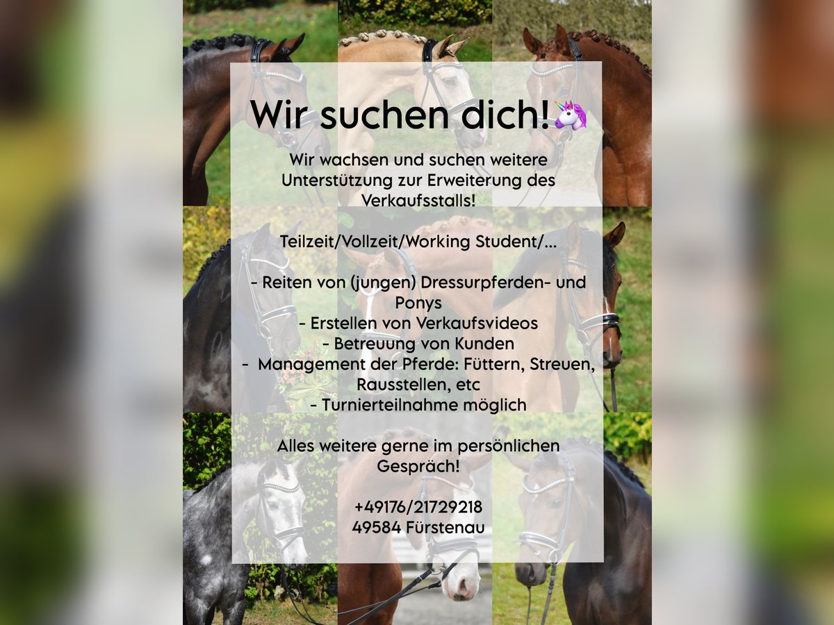 Looking for a trainer or groom (m/f/d) to join our sales stable in 49584 Fürstenau! We are seeking support for our team to manage approximately 20-25 sale horses. - Riding (young) dressage horses and ponies or preparing/cleaning them for riding - Taking sales photos and videos - Attending to customer appointments - Joint management of horse care: feeding, mucking out, turnout - Participation in competitions possible We are not necessarily looking for a fully qualified trainer, but rather someone with understanding and sensitivity for horses, and enjoyment in the work. A groom who assists with tacking up and handles all tasks related to riding is also welcome. Since most of our horses are young and well-behaved, experience with young horses is essential. Part-time, full-time, working student positions, internships, or similar arrangements are all possible. Regular working hours, fair pay, and a pleasant working environment are of course guaranteed! Please feel free to contact us for more information! +49 176 21729218