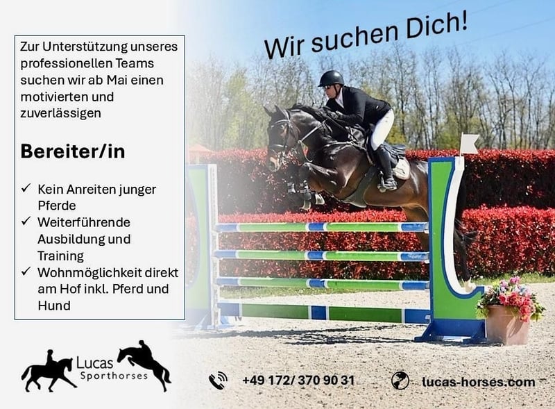 Zur Unterstützung unseres professionellen Teams suchen wir ab Mai einen motivierten und zuverlässigen Bereiter/in - Kein Anreiten junger Pferde - Weiterführende Ausbildung und Training • Wohnmöglichkeit direkt am Hof inkl. Pferd und Hund