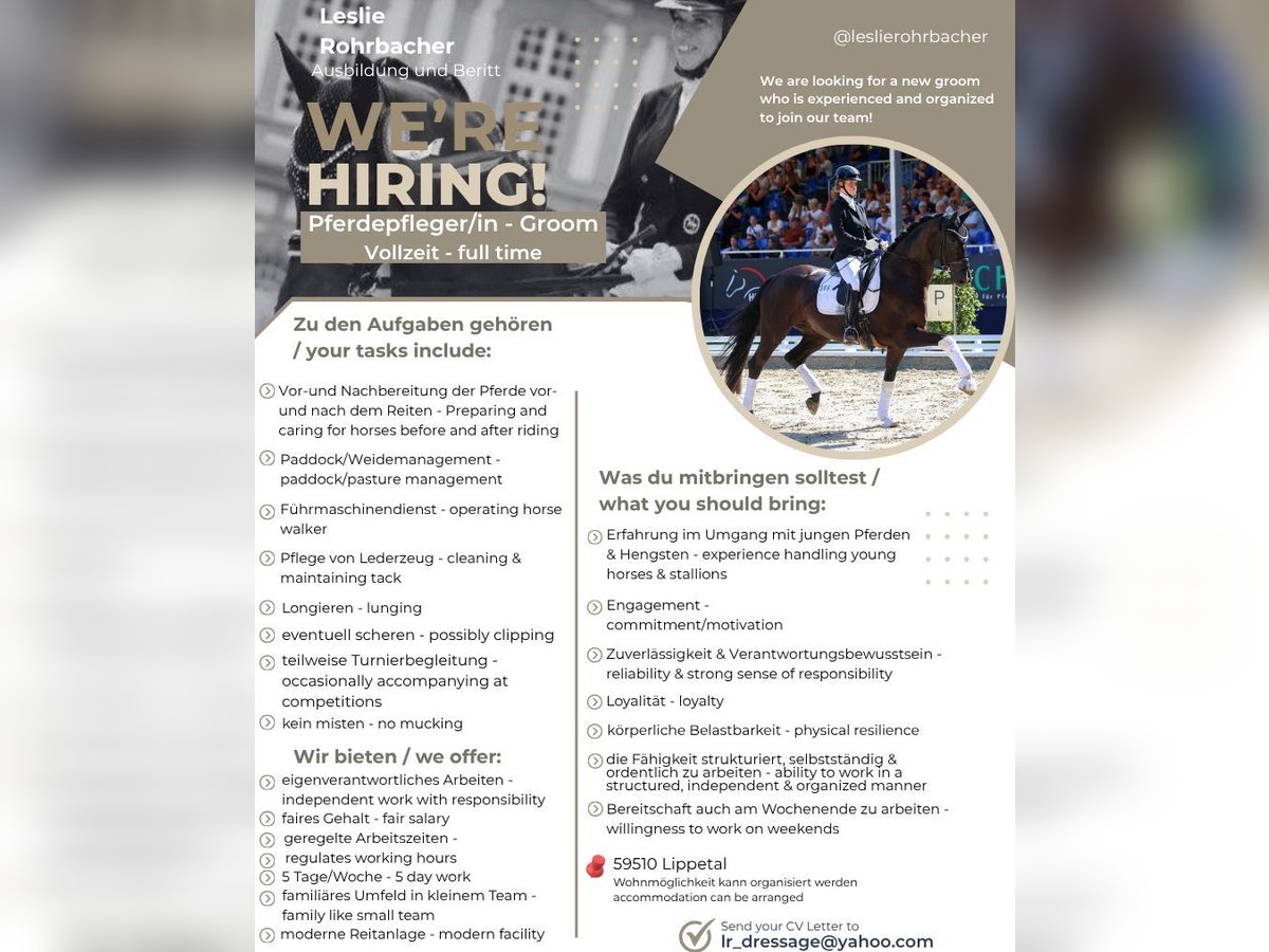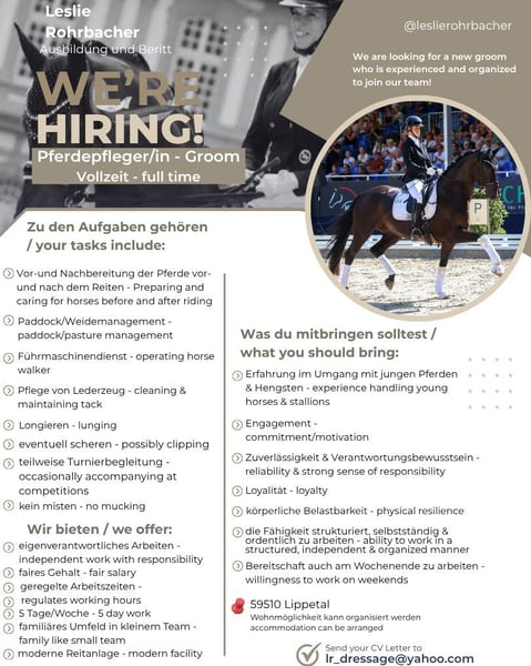 Wir suchen für unseren Dressurausbildungsstall eine/n motovierte/n Pferdepfleger/in. Weitere Informationen im Bild
