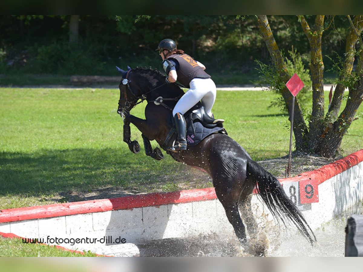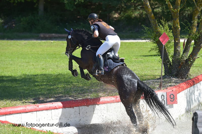 Ausbildung des jungen Pferdes – der Weg vom Züchter zum Verlasspferd: Petra Kronwitter hält beste Kontakte zu den Züchtern und ist mehrmals im Jahr in Vorort, wo sie direkt auf den Weiden die Pferde begutachtet. Diese direkte Zusammenarbeit mit den Züchtern bringt alle positiven Voraussetzungen mit, die ein zukünftiger Pferdebesitzer beim Kauf finden möchte: Drei Eckpfeiler, die ein gutes Pferd ausmachen: 1. Die Züchter kennen über viele Pferdegenerationen die Blutlinien ihrer Pferde und damit verbunden die Eigenschaften, die vererbt werden. 2. Alle Pferde wachsen in einer herrlichen, gesunden Landschaft in einer Herde mit den verschiedenen Altersgruppen auf und erhalten dadurch eine natürliche Sozialisierung. Sie bekommen viel Muskulatur und gute Lungen, wenn sie lernen, sich auf den hügeligen Weiden trittsicher zu bewegen. Wenn sie dann 3-jährig sind, fehlt den jungen Pferden allerdings eine fundierte, korrekte Ausbildung zu verlässlichen Reitpferden. 3. Die übernimmt Petra Kronwitter dann, wenn sie sich vom freundlichen und positiven Charakter der Pferde überzeugt hat. Sie wählt einige aus und holt sie zu sich in ihren Stall in Mainbernheim, wo sie in den nächsten Monaten ausgebildet werden. Petra hat meist schon Anfragen von Kunden und sucht sich die Pferde aus, von denen sie überzeugt ist, dass sie zu den Familien oder Turnierreitern gut passen könnten. So gibt es die sportlichen, die sensibel und leistungsbereit unter dem Reiter sind, genügend Potential in den die Grundgangarten haben, sich geschickt beim Springen anstellen oder mutig im Gelände über Gräben und feste Sprünge gehen. Trotz dieser wunderbaren Rittigkeit sind sie immer klar im Kopf. Diese sensiblen Pferde verlangen nach einem feinfühligen, aber mutigen Reiter, um im Leistungssport oder auf der Jagd ihr Können zu zeigen. Oder es gibt die gutmütigen, gelassenen und braven Pferde, die nach korrekter Ausbildung als Familien- und Freizeitpferd den zukünftigen Besitzern viel Freude machen und den eher vorsichtigen Reitern viel Vertrauen geben. Wenn die Pferde dann entsprechend ausgebildet sind, werden sie oft von Junioren der Reitschule auf Turnieren vorgestellt oder gehen bei Reitjagden mit, so dass die Interessenten wissen, dass das Pferd im Sport erprobt ist, sich verladen lässt und durch seinen guten Charakter ruhig, aber leistungsbereit alles mitmacht.