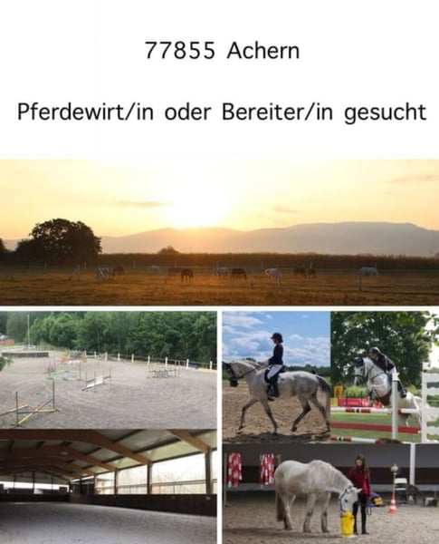 Wir suchen zum nachstmöglichen Zeitpunkt eine/n engagierte und motivierte Reiter/in oder eine/n Praktikant/in für unseren Reit- und Ausbildungsstall in 77855 Achern-Wagshurst. Das Reiten von jungen Pferden ist der Aufgabenbereich, die bei entsprechender Qualifikation gerne auf dem Turnier vorgestellt werden können, Springen und Dressur. Wir könnten uns einen Teilzeit/Nebenjob, aber auch stundenweise vorstellen. Wir sind ein Familienbetrieb, geben Reitunterricht und bilden junge Pferde und unsere Schulponys aus. Wir freuen uns auf Ihre Nachricht! pascale.lipp@mail.de +4916098752249