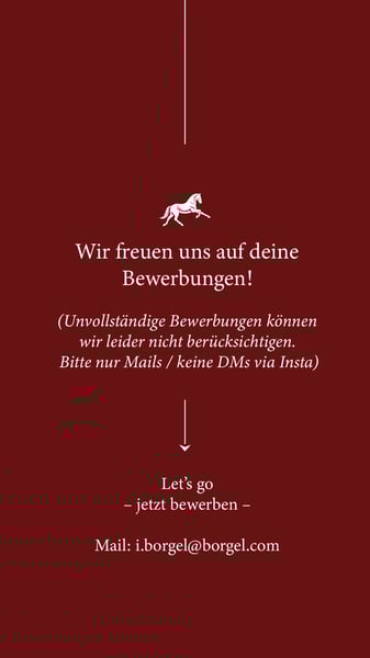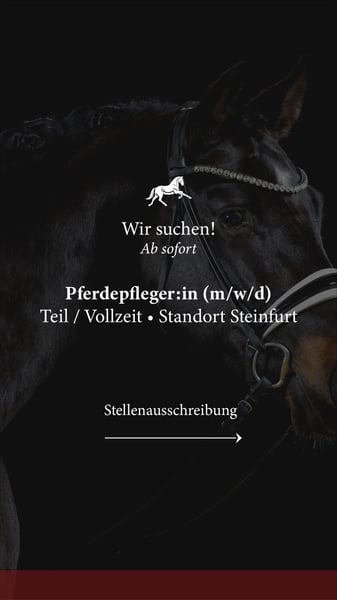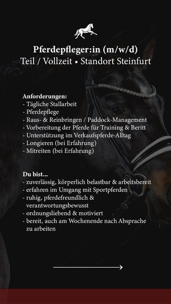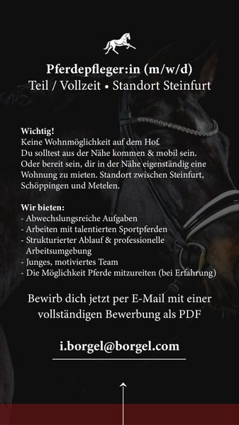Pferdepfleger:in (m/w/d) Teil o. Vollzeit Anforderungen: - Tägliche Stallarbeit - Pferdepflege - Raus- & Reinbringen / Paddock-Management - Vorbereitung der Pferde für Training & Beritt - Unterstützung im Verkaufspferde-Alltag - Longieren (bei Erfahrung) - Mitreiten (bei Erfahrung) Du bist... - zuverlässig, körperlich belastbar & arbeitsbereit - erfahren im Umgang mit Sportpferden - ruhig, pferdefreundlich & verantwortungsbewusst - ordnungsliebend & motiviert - bereit, auch am Wochenende nach Absprache zu arbeiten Wichtig: Keine Wohnmöglichkeit auf dem Hof Du solltest aus der Nähe kommen & mobil sein. Oder bereit sein, dir in der Nähe eigenständig eine Wohnung zu mieten. Standort zwischen Steinfurt, Schöppingen und Metelen. Wir bieten: - Abwechslungsreiche Aufgaben - Arbeiten mit talentierten Sportpferden - Strukturierter Ablauf & professionelle Arbeitsumgebung - Junges, motiviertes Team - Die Möglichkeit Pferde mitzureiten (bei Erfahrung) Jetzt bewerben mit einer vollständigen Bewerbung per Mail an: i.borgel@borgel.com