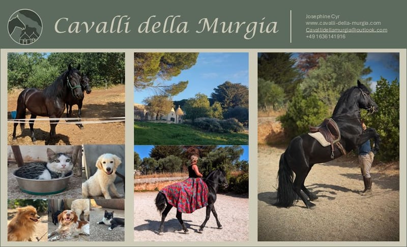 Do you have experience working with horses and are you interested in the training and development of young horses? Then you’ve come to the right place! We offer an exciting internship position in Apulia, Italy – set amidst stunning landscapes and a family-like environment. You will be actively involved in working with our young Murgesen horses: from daily handling and groundwork to riding practice. Openness, eagerness to learn, and a loving approach to the animals are our top priorities. What to expect: • A varied internship experience (minimum 4 weeks) • Assisting in the training and promotion of young horses (Murgesen breed) • Support with stable chores • Opportunities to participate in events and show riding • Insights into the daily operations of a horse farm in Southern Italy • While financial compensation is limited, you will gain valuable experience, learning opportunities, and unforgettable impressions What you should bring: • Some previous experience with horses • Interest in working with young horses • Reliability, motivation, and team spirit • Enjoyment of physical work and handling animals • Openness to new experiences and cultures If you’re eager to join our team and want to develop further, please get in touch! We look forward to receiving your application and to meeting you – perhaps under the Italian sun very soon! Interested? Feel free to contact us at: cavallidellamurgia@outlook.com