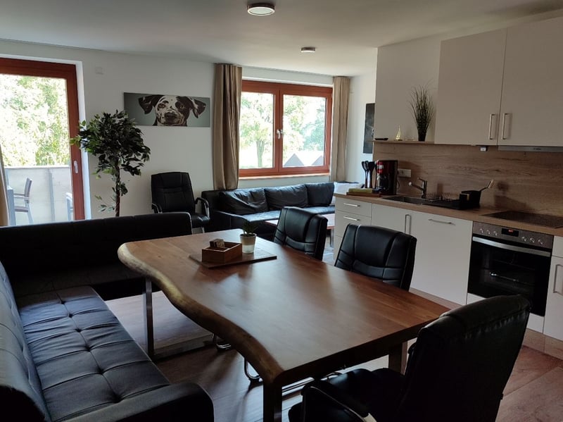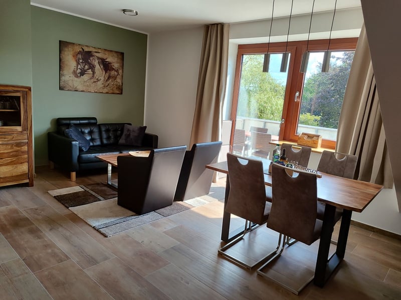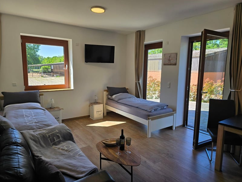 Wir haben 2023/2024 unseren ehemaligen Reiterhof zu 12 gemütlichen und großzügigen Ferienwohnungen umgebaut. Alle Wohnungen und Apartments verfügen über eine Terrasse oder über einen Balkon und sind barrierefrei eingerichtet. Die oberen Etagen können neben dem Treppenhaus auch mit dem Fahrstuhl erreicht werden. In Metelens Wäldern und der Metelener Heide gibt es ein kilometerweites, wunderschönes Reitgebiet mit tollen Sandstrecke und schönen schattigen Waldwegen. Ihr könnt gleich vor der Haustür losreiten. Für die Pferde stehen helle Gastboxen zur Verfügung und tagsüber können die Pferde stundenweise auf die Weide oder auch in der Bewegungshalle laufen. Ein zusätzlicher Sandpaddock ist in Planung. Nach einem schönen Ausritt können sich Reiter und Pferd gleich im eigenen See direkt vor der Haustür abkühlen oder einfach eine Runde zusammen schwimmen :-). Für Gäste ohne eigenes Pferd bieten wir verschiedene Reitprogramme an: die ganz Kleinen können ihre ersten Reitversuche auf ganz lieben Ponys beim Ponyreiten wagen. Diejenigen, die schon über eine gewisse Reiterfahrung verfügen, können optional Bahnstunden für den Aufenthalt dazu buchen und die fortgeschrittenen Reiter, die sicher in allen Gangarten ihr Pferd im Gelände reiten, können zwei- oder dreistündige Ausritte durch unser wunderschönes Reitgelände buchen. Diese Angebote gelten für die Ferienzeiten von NRW, weitere Reitangebote gerne auf Nachfrage. Aber natürlich gibt es auch viele andere tolle Möglichkeiten zur Urlaubsgestaltung auf unserem Hof :-) Am Haus liegt ein schöner Spielplatz, eine Fußballwiese ⚽️, eine Tischtennisplatte 🏓 und der Fuhrpark 🛻🚜🛴🚘 für die Kids fehlt natürlich auch nicht. Neben unseren Pferden 🐴 sind noch Hunde 🐶 und Katzen 🐱 bei uns zu Hause, die sich immer über Streicheleinheiten freuen. Am See liegen ein Ruderboot 🚣♀️ und ein Tretboot für gemütliche Runden bereit. In der Nähe gibt es schöne Ausflugsziele und auch die Minigolfanlage in der Metelener Heide liegt gleich um die Ecke und ist genauso einen Besuch wert wie der Naturzoo Rheine und das Tierfreigehege in Saerbeck. Zum Shoppen lädt das Outlet Center Ochtrup www.mcarthurglen.com und das nahegelegene Enschede mit seinen Markttagen gleich hinter der holländischen Grenze ein. Weitere Infos findet Ihr auf unserer Homepage unter www.seehof-reuter.de Infos zu den Gastboxen bzw. zu den Reitangeboten findet Ihr hier: https://seehof-reuter.de/de/3811696/reiten Wir freuen uns auf Euren Besuch 🙂.