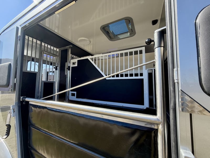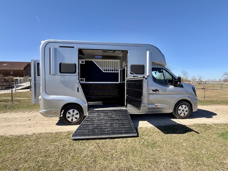 2-Horse Transporter with Stallion Equipment and Automatic Transmission – 5-Seater New model of the Renault Master with 170 HP, 9-speed automatic transmission, five seats, onboard computer, multimedia system with Bluetooth connectivity – Apple CarPlay/Android Auto, navigation system, cruise control, and speed limiter, trailer hitch with a 2,500 kg towing capacity, and more. Horse Compartment • Sturdy, lightweight construction with insulated roof profile • Wide side ramp with low entry and lift-up door • Horse area for up to two horses • Movable partition system • Two pivoting doors in the horse compartment – each horse accessible individually via saddle chamber • Impact protection padding on the rear wall • Two electric roof fans – switchable from the driver’s cab • Day and night lighting controllable from the driver’s cab (white and blue) • Large roof window and two side windows with protective covers • Monitor for video surveillance of the horse area and reverse camera • Saddle chamber with bridle hooks and adjustable saddle rack • Soft, durable, waterproof rubber flooring • 16" all-season tires Additional Equipment • Stallion package with grille enclosure and fully enclosed head doors • Stainless steel grille • Leather seats • Metallic paint finish Further information and pictures are available upon request at any time. Subject to prior sale and errors excepted.