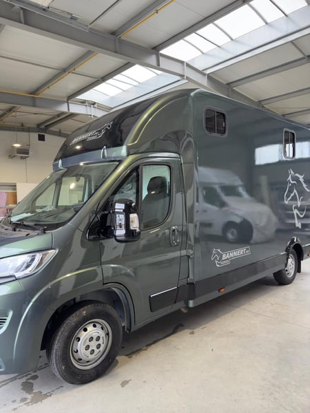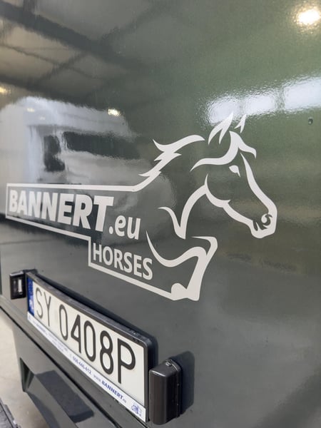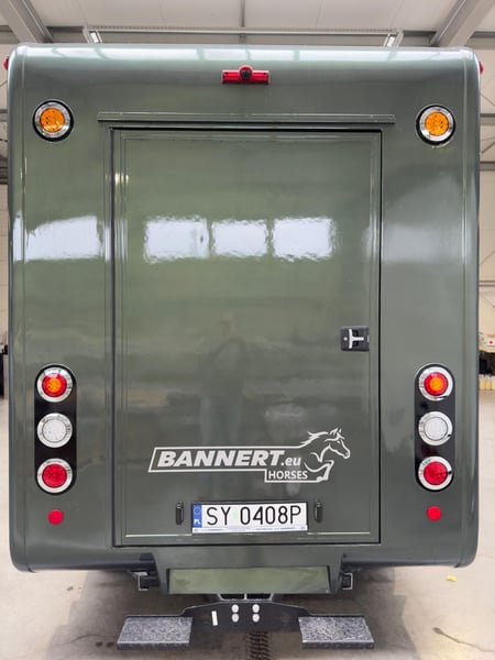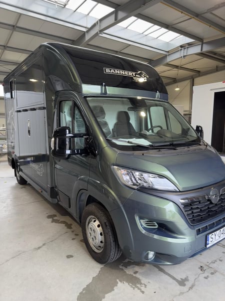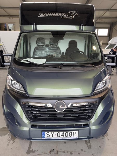 Hello! We have for sale a new horse trailer designed for two horses. The vehicle shown in the pictures has been sold, but we currently have an identical horse trailer for sale, however, in a dark green color as presented in the video. I warmly invite you to make a purchase, Ewa Głodzińska tel 662 227 067. Banner HORSE TRUCK specifications of the structure: Internal dimensions of the structure: 3700 x 2050 x 2295 mm Opel MOVANO / DMC 3500kg Characteristics of the container structure: ⦁ Container individually tailored to the model of the vehicle ⦁ Walls and roof made of sandwich panels, consisting of white laminate as the inner and outer layer and XPS core - moisture-resistant material ⦁ Floor as an integral part of the container - reinforced rubber mat flooring ⦁ Walls and roof reinforced with aluminum profiles, painted, white ⦁ Roof spoiler with fairings ⦁ Side entrance ramp for the horse 2000mm ⦁ Internal LED lighting ⦁ Front wall reinforced with aluminum panels ⦁ Opening skylight ⦁ Three windows on both sides of the structure ⦁ 12V intake and exhaust fan ⦁ Beam for the hitch ⦁ Lighting in the luggage compartment ⦁ Centrally located rear doors ⦁ Triple LED rear lights ⦁ Lined walls ⦁ Separate ventilation ⦁ Rearview camera ⦁ Partition between horses ⦁ Partition wall with doors for heads ⦁ Calming light for the horse during travel, blue "UV" ⦁ Camera in the horse area ⦁ Ventilation grilles ⦁ All metal elements made of polished stainless steel