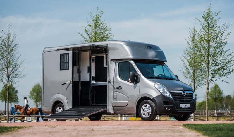 Marca: AKX Telaio: Opel Movano Peso: 3,5T Potenza (CV): 165 Cavalli: 2 Dimensioni: 2,1 x 6,2 x 2,8 m Spazio cabina Sedili con braccioli Radio / MP3 / Bluetooth - GPS Finestrini e specchietti elettrici Chiusura centralizzata Gancio traino Climatizzatore Cruise control Fari fendinebbia Spazio cavalli Paratia regolabile Ventilazione lucernario e finestrini laterali Illuminazione a LED blu/bianco Sellaio con portasella e portahoof Pavimentazione in gomma Registrazione della temperatura Tubo dell'acqua Fissaggi per le catene