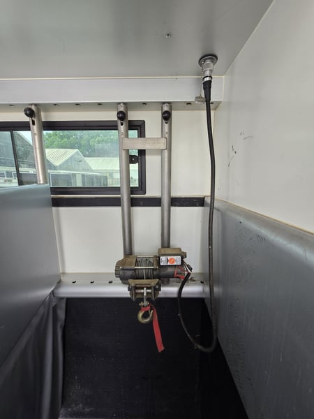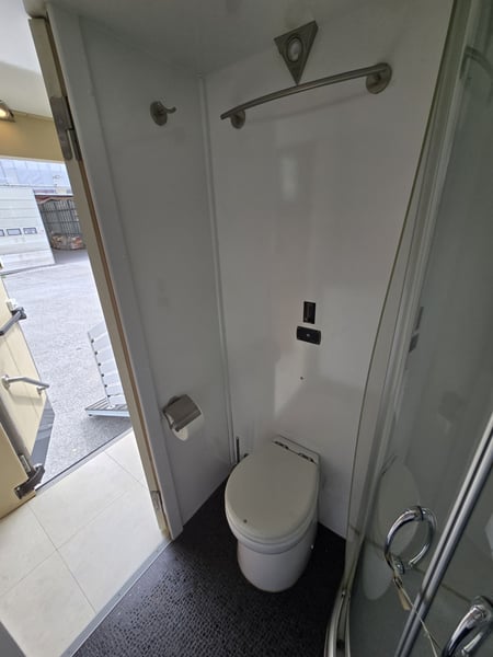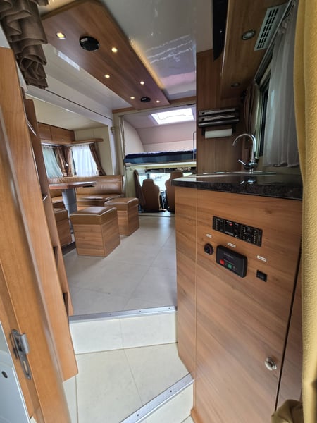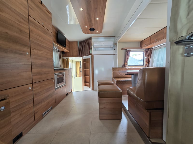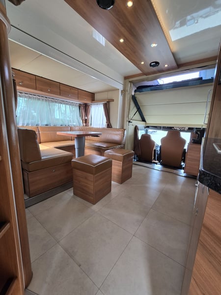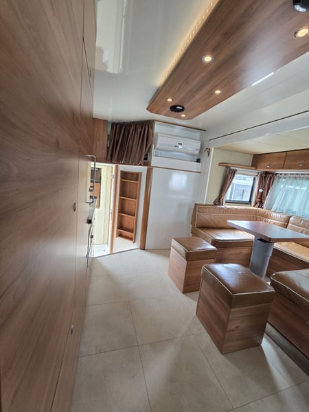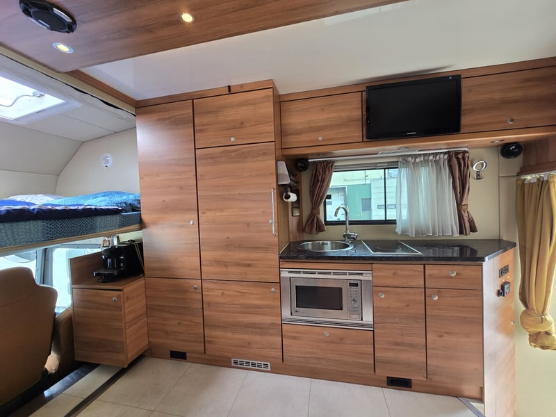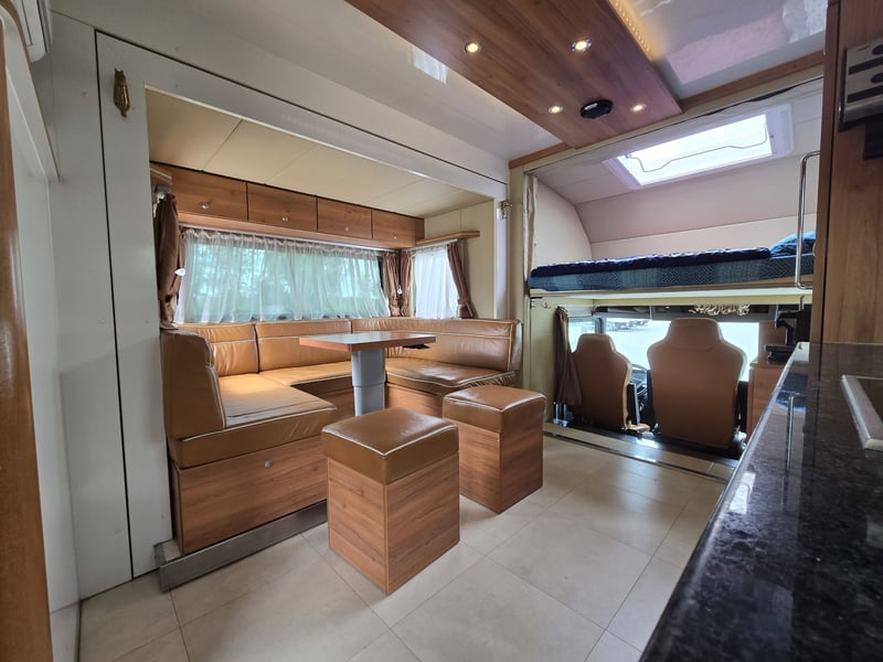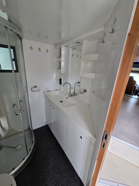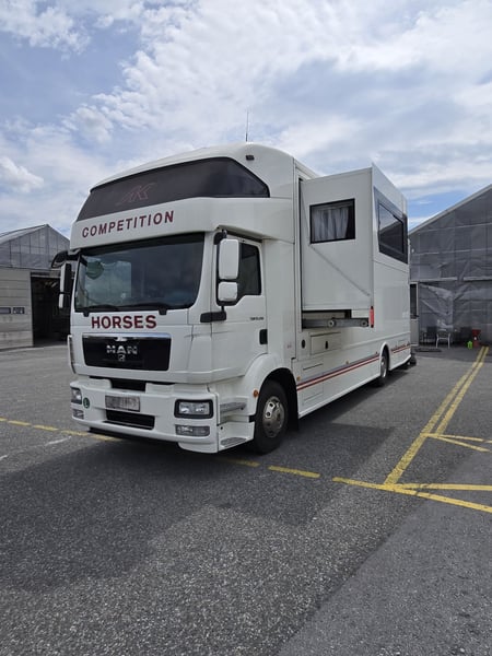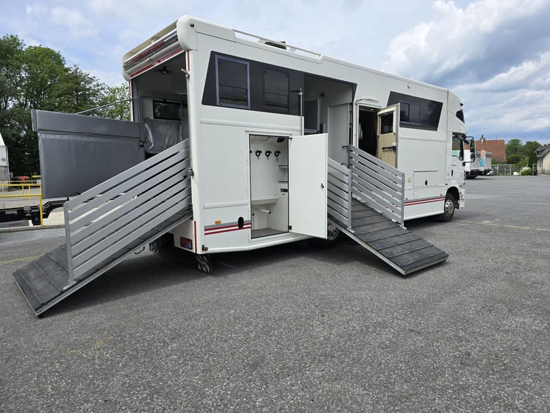 Zulässiges Gesamtgewicht: • 15.000 kg Anzahl Pferde: • 5 Pferde Aufbau: • Aufbau aus Aluminium • Aufbau für 5 Pferde • Heck- und Seitenrampe • Wohnabteil mit Pop-Out • Frischwassertank (500 Liter) isoliert Abfälle (250 Liter) und WC (150 Liter) Fahrgestell: • Euro 5 • vollluftgefedert • Zentralverriegelung • Klima • Fahrerhaussitze mit echtem Leder • Rückfahrkamera • Differentialsperre Wohnabteil: • elektrisches Pop-Out-System • Bett über Badezimmer und über Führerhaus • Küche mit großer Arbeitsfläche • Sitze mit echtem Leder bezogen, konvertierbar Bett mit Stauraum 6 Schlafplätze – 2 über dem Fahrerhause, 2 im Pop-Out • Split Klimaanlage für Wohnraum 2.5 KW kühlen und heizen • TV im Wohnbereich, LED Beleuchtung, • Badezimmer Dusche, WC und Waschbecken mit Kleiderschrank und noch vieles mehr. • Webasto Luftheizung 3,9 kW • Edelstahlspüle • Elektro-Keramik-Herd • Kühlschrank mit Gefrierfach • Mikrowelle • DVD und 5.1-Soundsystem • Schiebefenster mit Mattglas • Dusche mit Glastüren • Häcksler Toilette Sonderzubehör: • Staufach unter Wohnabteil • AHK Kugel • Große Sattelkammer • 3 KW Benzinstromgenerator • Seilwinde • 3 eingetragene Sitzplätze • Zulassung als Sonderkraftfahrzeug