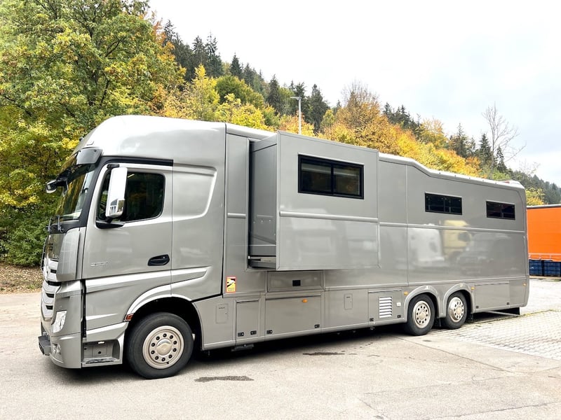 Mercedes-Benz 2551 Pferdetransporter für bis zu 6 Pferde mit Pop-Out und großer Wohnkabine EZ 07/2019, 25to. zulässiges Gesamtgewicht, ca. 89.000 km, 510 PS, Euro6, Diesel, Automatik, Tempomat, Klimaautomatik, etc. Fahrzeug mit Mercedes-Benz Aluminiumfelgen ausgestattet! Fahrzeugbeschreibung: • Sitzgruppe mit Tisch und Möglichkeit zum Umbau in einen Schlafplatz • Küche mit Waschbecken, Kühlschrank, Kochstelle und Mikrowelle • TV • Klimaanlage und Heizung • Topsleeper für zwei Personen über dem Fahrerhaus elektrisch absenkbar • Bett über dem Bad • Bad mit Häcksler-Toilette, Dusche, luxuriösem Waschbecken und Spiegel Pferdeabteil • Für den Transport von sechs Pferden • Heck- und Seitenrampe • Deckenablage • Stauraum für Sättel, Trensen, etc. an der Außenseite des Fahrzeugs • Ventilation • Dachfenster • Tag- und Nachtfahrlicht • Durchgangstür vom Pferderaum zum Wohnbereich • Trennwände mit schwenkbarem Kopfteil – zwei Knick-Trennwände • LCD Monitor mit Rückfahr- und Pferdeabteilkamera MwSt. ausweisbar! Weitere Informationen und Bilder gerne auf Anfrage! Besichtigungen bitte nur nach vorheriger Terminvereinbarung. Irrtümer und Zwischenverkauf vorbehalten.