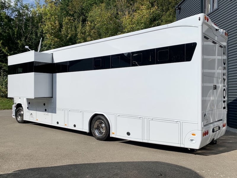 Vehicle coming soon and available shortly! Mercedes-Benz Actros 1835 RJH Exclusive H5 horse transporter with slide-out and roof raise above the bathroom! The Mercedes-Benz Actros 1835 features full equipment, 354 HP, automatic transmission, diesel engine, Euro 6d, with a permissible gross weight of 18 tons, a 3,500 kg towing capacity with the hitch, active cruise control, navigation system, full air suspension (front and rear), seat heating, mirror cameras, and more. RJH EXCLUSIVE H5 conversion with MEGA SLIDE-OUT - Large top sleeper bed above the cab - Separate bathroom with shower (Rain-Dance function available) and ceramic toilet, washbasin, and bathroom cabinet - Separate sleeping area above the bathroom - Entertainment system with flat-screen TVs, automatic satellite system (also functioning on 12 V), and additional TV - Complete LED lighting - Leather interior – walls and ceiling partly covered with Skai leather - Up to 6 sleeping options in total and a separate grooming compartment - Large driver’s cab entry with triple safety sealing system, completely waterproof - Construction and all technical systems are fully winter-proof down to at least -20°C! (suitable and tested for professional use) Horse compartment - Horse area for up to 5 horses, winch, rear and side ramps with ramp limiters - Premium stainless steel partition walls with a new system, completely trog-free - Two mechanical Easy-Lift ramps (side and rear) with integrated locking and aluminum ramp limiters - Monitoring camera inside the horse area and reverse camera - Two large adjustable roof hatches, sliding windows on driver and passenger sides, and two professional electric fans for optimal air circulation - Several insulated storage compartments (waterproof and moisture-free) and an external saddle chamber for saddles and bridles, as well as blanket racks - The entire construction is fully insulated and winter-proof, ensuring a significantly cooler environment for the horses even on hot days Further information and images are available upon request at any time! Visit us for a viewing and professional consultation by appointment! RJH brochure with all vehicles available in print or digital format upon request. The Roland Bauer Group offers a constantly large selection of 30–35 horse transporters across all categories and sizes.