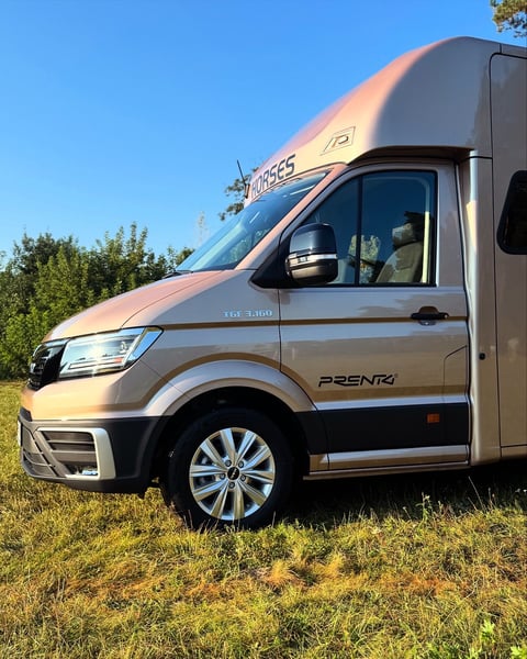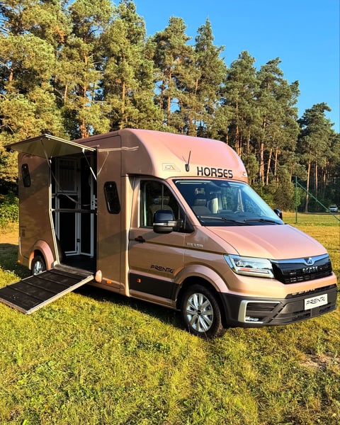 Horsebox MAN/Prentki TGE – Available for Immediate Delivery As a manufacturer of specialized horse transport bodies, we present a ready-to-deliver horsebox built on a MAN TGE chassis 2025. The vehicle has been designed with a focus on safety, horse comfort, and driver and passenger convenience. Warranty: - 36 months on the bodywork – unlimited mileage ✔ - 24 months on the chassis (MAN) ✔ Technical Data: - Year of manufacture: 2025 - Number of seats: 5 (extended cab) - Engine: 2.0L EU6 SCR, 163 HP (120 kW) - Transmission: 8-speed automatic (AQ) - Drive: front-wheel drive - Gross permissible weight: 3,500 kg (driving license category B) Cabin Equipment: - Climatic air conditioning - Cruise control and intelligent speed limiter - Lane keeping assist, autonomous emergency braking, traffic sign recognition - LED main headlights with daytime running lights, fog lights with cornering function - Light Assist high beam assistant - Leather, heated multifunction steering wheel with Tiptronic - MAN Media Van Business Navigation multimedia system with 12.9" screen and smartphone integration (wireless charging) - Driver and passenger airbags, Start-Stop system, ESP, ABS, hill-start assist - All-season tires, electrically adjustable and heated mirrors Horse Area: - Insulated walls and ceiling with 30 mm panels - Aluminum floor covered with anti-slip rubber - Aluminum entry ramp with ribbed rubber and lift-up flap - Two-position partition wall and fixed breast wall - Interior lined with rubber up to 1,000 mm height and protective padding - Two roof vents and two 12V fans - Interior lighting and an additional rear work lamp - Side and front windows providing ventilation and natural light - Monitoring: interior camera and reversing camera - Tow hitch, rear step, ramp hinge cover, rigid ramp safety devices Body Color: Pale Copper Metallic Vehicle available immediately – no waiting period PRENTKI Multi-Industry Company is currently an authorized manufacturer of bodies for brands including Renault, MAN, Mercedes, Fiat, among others, producing medical ambulances, campers, courier vehicles, and retail vehicles. The company’s main and most dynamic sector is the production of new horseboxes. Having built over 1,000 such vehicles, PRENTKI continues to strengthen its position on the Polish market and abroad. Customers choosing PRENTKI vehicles benefit from well-designed constructions and solutions backed by many years of experience. We place utmost emphasis on safety and functionality. All materials used in the production of our bodies are certified, and the structural solutions undergo testing, as confirmed by EU type approval. On March 1, 2019, our company received the ISO 9001:2015 certification, confirming compliance with quality management standards. In 2003, PRENTKI obtained the PN-EN ISO 9001:2001 quality system certificate. Our trading partner in Germany, Dickenherr Trucks & Trailers GmbH, always has vehicles in stock and is happy to assist you!