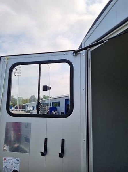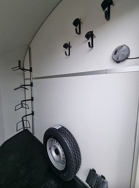 Remorque aluminium grand volume pour 4 chevaux avec chargement en biais, rampe latérale, sellerie équipée, toit renforcé, et aménagement intérieur entièrement modulable. Idéale pour un transport professionnel, sécurisé et confortable.