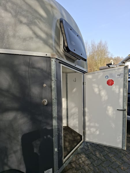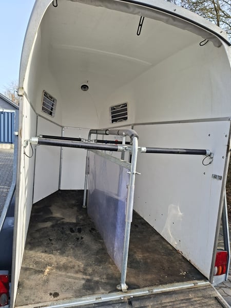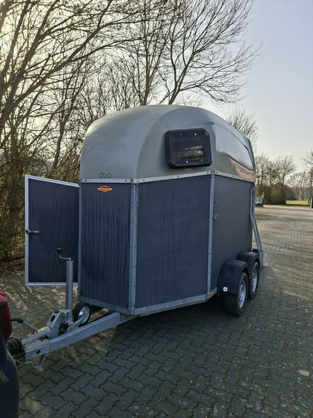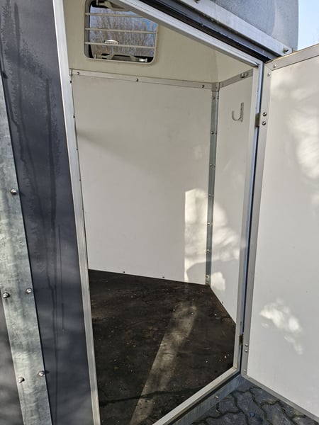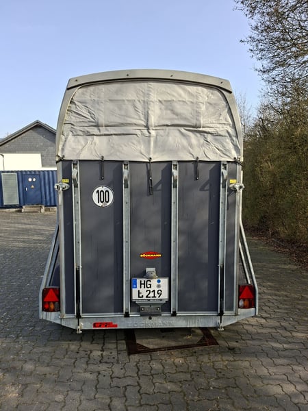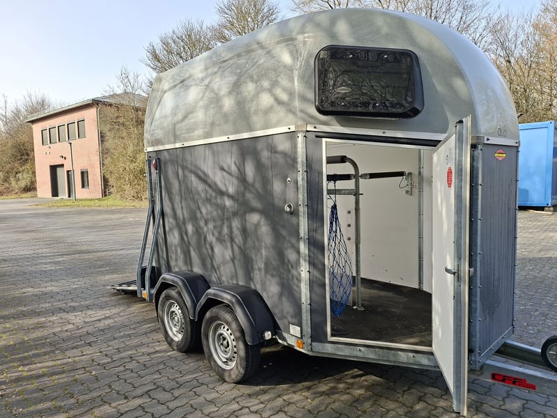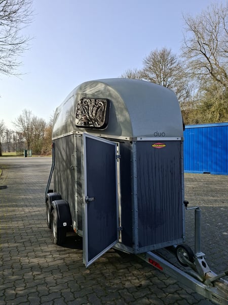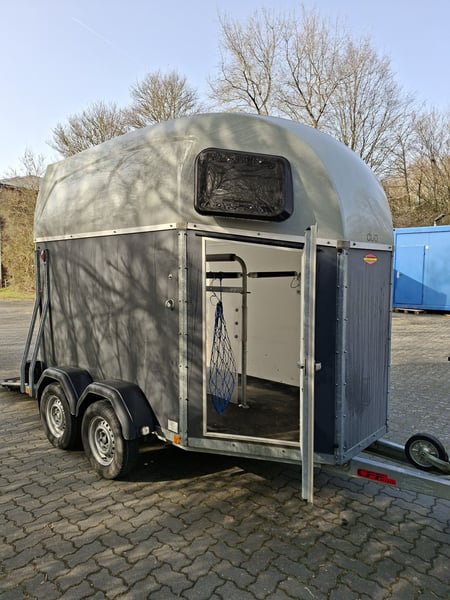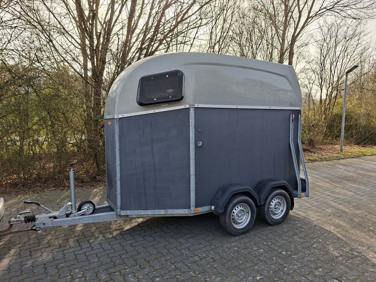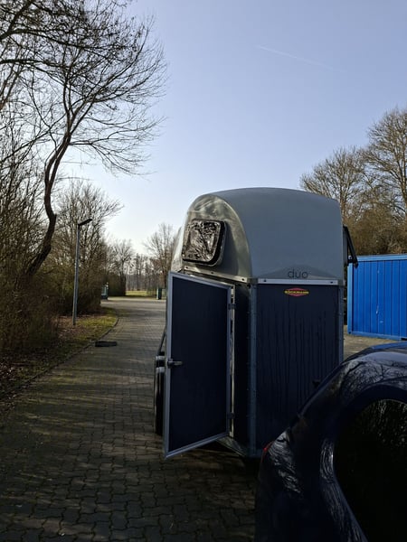 Beschreibung: Wir verkaufen einen gebrauchten Böckmann Pferdeanhänger Duo Esprit ohne Sattelkammer. -Reifen NEU -TÜV Neu -Erstzulassung 2018 -zul. Gesamtgewicht: 2400 kg -Leergewicht: 809 kg -Nutzlast: 1591 kg -Einstiegstür rechts, abschließbar -Gummi auf der Beladeklappe -Auftritt an Hinterklappe -Planenlift -Lichtanlage und Stecker 13-polig -Polywood-Boden -Innenbeleuchtung weiß -Stützrad