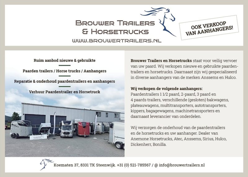 Brouwer Trailers en Horsetrucks staat voor veilig vervoer van uw paard. Wij verkopen nieuwe en gebruikte paardentrailers en horsetrucks. Wij verzorgen de onderhoud van de paardentrailers en de Horsetrucks en uw aanhanger. Wij zijn Dealer van Anemone Horsetrucks, Atec, Anssems, Sirius, Hulco, Dickenherr, Bonilla.