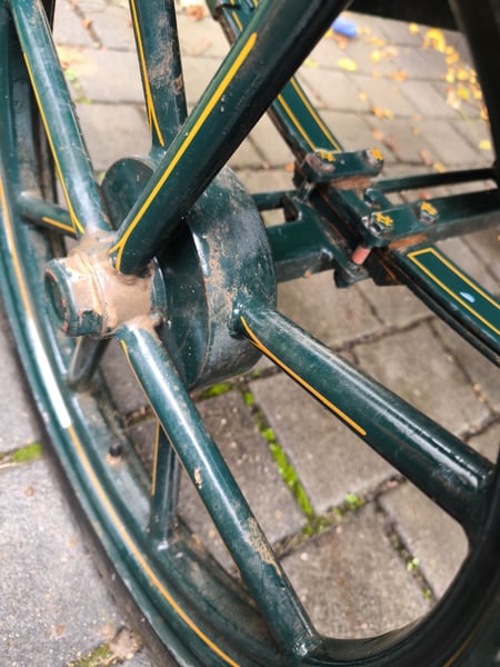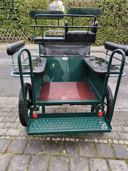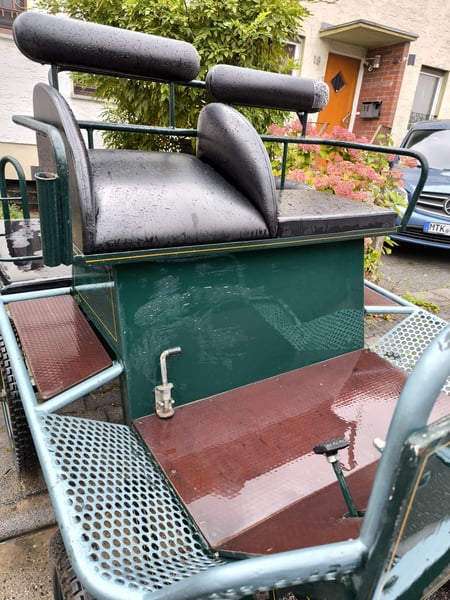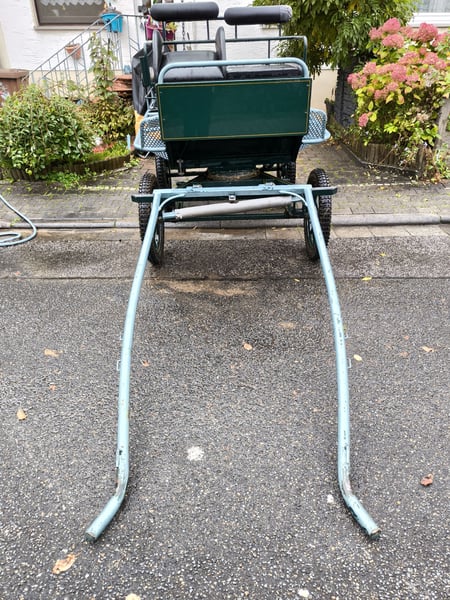 Schöne leichtläufige, geländegängige Kutsche. Gebrausspuren. Luftbereift mit Trommel- und Feststellbremse. Bockhöhe 1,30m, Spurbreite 1,3m, Länge ca 2,1m, inkl. Schere Nur Selbstabholer