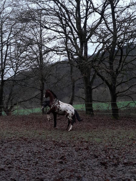 Nomen est Omen: Karma impresses not only with his stunning appearance but also with excellent movement in all three basic gaits. He has a correct conformation paired with plenty of frame. He embodies the modern sport horse type and will undoubtedly mature into a large rider’s mount. At just 20 months old, he already measures 1.55 meters at the withers. He is herd-friendly, well-behaved in handling, familiar with trailer loading, and knows the basics of foal training. He is farrier-friendly and eager to receive further training. He is being sold directly by the breeder. Karma has ApHC registration papers and is registered with the ApHCG. He was the national champion of his foal crop.