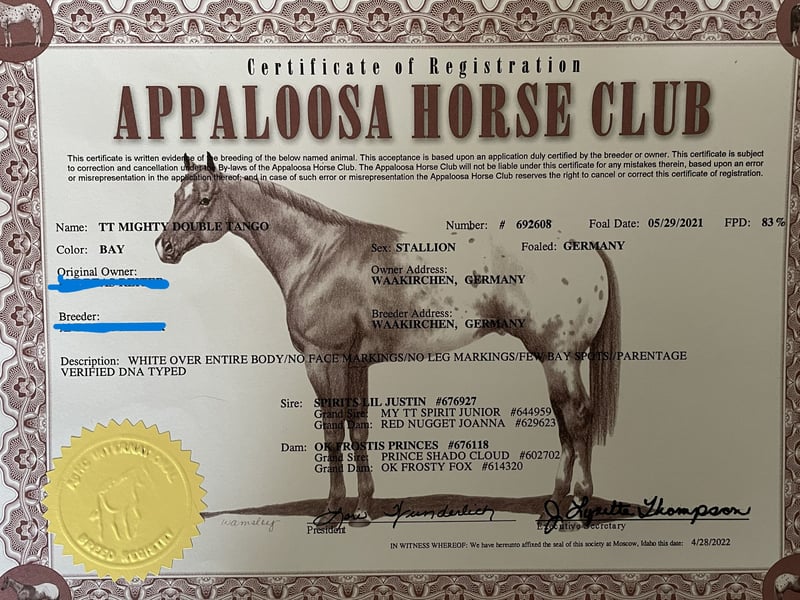 Golden B Appaloosa Horses kündigt den Verkauf von TT Mighty Double Tango an – einem beeindruckenden Hengst. Sein Pedigree spricht für sich: mit TT Mighty Junior, 22-mal Europameister. Er ist zu 100 % farbvererbend bei allen Pferderassen (Leopard oder nahezu Leopard). Er ist der Hengst, den Sie in Ihrer Appaloosa-Zucht benötigen. Er ist gut erzogen, steht zwischen den Stuten im Stall und besitzt ein sanftes Wesen. Auch künstliche Besamung ist kein Problem – sein Sperma ist perfekt für die Tiefkühlung. TT ist sowohl unter dem Sattel als auch in der Kutsche ausgebildet.