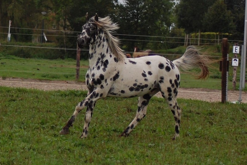 Questo cavallo è il protagonista dello spettacolo con il suo aspetto e il suo grande movimento. Dalle migliori linee di sangue appaloosa olandesi: Padre Campione olandese di 1° premio Peru's First Class (con molto sangue KWPN, come Krack C e Jazz). Madre Star Mare, Campionessa di Riserva Padre della madre Palousa Convenance, 5 volte campione olandese (suo padre è Gibraldi, il grande stallone nero da Gran Premio che ha partecipato alle finali di Coppa del Mondo con Edward Gall a Las Vegas). Un karakter molto dolce e affettuoso, un po' timido. Può essere condotto alla cavezza, ma è ancora inesperto nell'addestramento. Viene sempre tenuto in un gruppo di giovani stalloni, con persone intorno. Si muove molto liberamente nel campo. Ora cerca un nuovo proprietario che voglia lavorare con lui. Sebbene sua madre sia stata allevata per il dressage, ama anche il salto, quindi mi aspetto che questo cavallo possa essere utilizzato a tutto tondo. È un uomo da spettacolo, è bravissimo davanti alla macchina fotografica e guida lo show con il suo aspetto imponente.