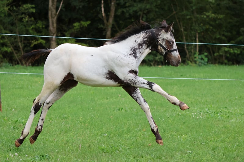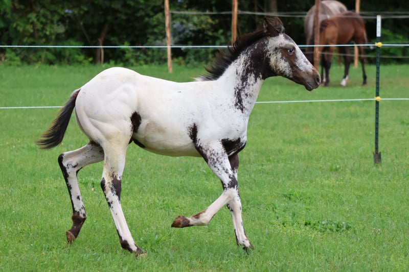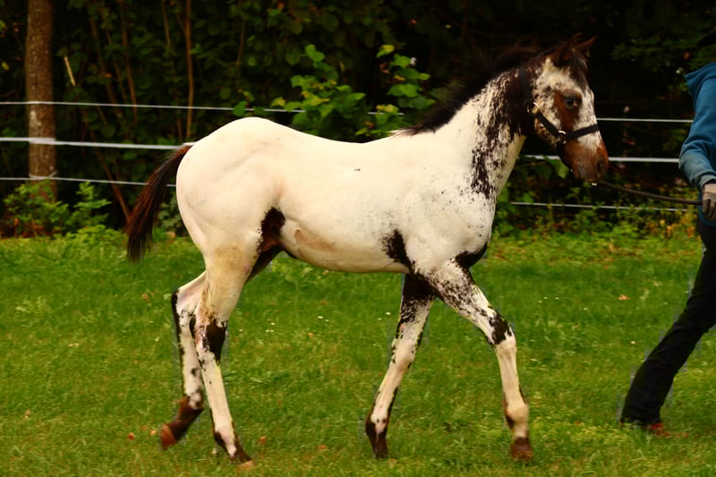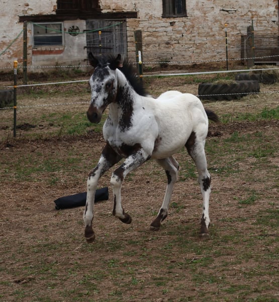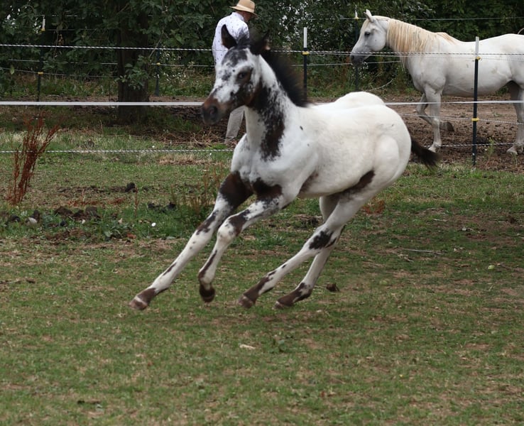 Zum Verkauf steht ein athletisches wunderschönes Few Spot Hengstfohlen mit dem Namen: BK White Cloud. Der Junge Mann ist sehr Menschen bezogen und kennt das Fohlen ABC Sein Vater ist der von uns gezogene BK Ragnar Olena, ein gekörter Hengst von unserem Ima Sioux Olena, der ebenfalls gekört ist. Seine Mutter ist unsere Roxys Lady in Dark, ihre gesamte Nachzucht ist prämiert. Also ein sehr interessantes Fohlen für Zucht und Sport. Dabei: COR und Equitenpass vom APHCG For sale is a beautiful, athletic, few-spot colt named BK White Cloud. This young man is very people-oriented and knows the ABCs of foaling. His sire is BK Ragnar Olena, a licensed stallion bred by us, by our Ima Sioux Olena, who is also licensed. His dam is our Roxys Lady in Dark, and all of her offspring have won awards. So, a very interesting foal for breeding and sport.