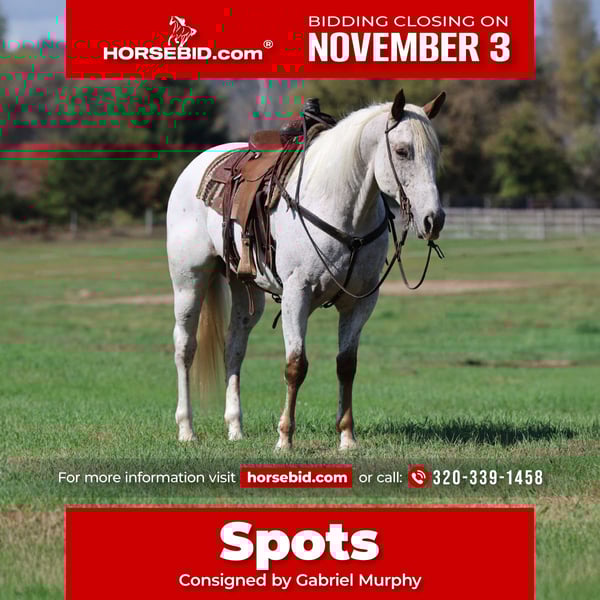 ⚜️𝐓𝐇𝐄 𝐅𝐀𝐋𝐋 𝐇𝐄𝐑𝐈𝐓𝐀𝐆𝐄 𝐂𝐋𝐀𝐒𝐒𝐈𝐂⚜️ Happening now thru MONDAY | NOVEMBER 3rd - Available EXCLUSIVELY on HorseBid's website! For more details and to register visit: www.Horsebid.com CONSIGNOR CONTACT: Gabriel Murphy 320-339-1458 LOCATION: Cannon Falls, MN BREED: Appaloosa REGISTERED: Yes REGISTERED NAME: Jacks Mac COLOR: White with spots HEIGHT: 15.3 AGE: 16 GENDER: Gelding Spots — Finished Head Horse for Sale Spots is a finished head horse that’s been there, done that, and seen it all. He’s been ridden at every level — including at the Jr. High National Finals — and is as solid as they come. Whether you’re looking for a horse to rope on or a trustworthy trail partner, Spots fits the bill. He’s a true walk-trot-lope horse that anyone can ride. We’ve had him for a long time, and no matter how long he’s been turned out, you can pull him out of the pasture and go ride. He’s gentle, broke, and dependable — the kind you can put your kids on to learn to rope or just enjoy a trail ride. Out on the trails, he’s a gentleman. He walks out nice and easy, has great brakes, and keeps his distance from other horses. He’s not spooky, doesn’t flinch at rustling leaves or branches, and rides the same whether you’re alone, in a group, or with dogs along. In the arena, he takes both leads at the lope, has a smooth trot, and an easy walk. He transitions seamlessly from the rodeo pen to the trails without missing a beat. Spots is up to date on all vet and farrier care. He’s gentle to catch, groom, and handle — suitable for any type of rider. If you’re looking for a trustworthy gelding that can do it all and take care of you or your kids, Spots is your guy.