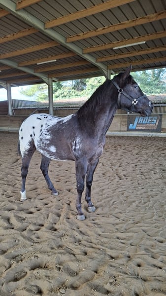 Beautiful Appaloosa colt. He is three years old, very well-built, with a gentle temperament. He features a large blanket with spots. He can comfortably stand in a herd with other horses. He has been professionally trained with basic groundwork and under saddle, as well as in harness. He is an all-rounder who can (and should) be further trained. For sale due to retirement. Several other Appaloosas are also available. Facebook: Golden B Appaloosa Horses