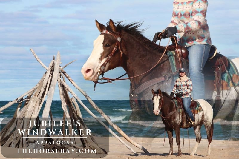 Jubilee’s Windwalker ist sein eingetragener Name. Er ist ein uriger, traditioneller Appaloosa mit alten Linien. Er stammt also von den guten Linien ab, die für ausgeglichene Köpfe, ruhiges Temperament und kräftige, kompakte Körper bekannt sind. Er ist muskulös, mit dicken Beinen und großen Füßen und kann problemlos auch einen größeren Reiter tragen. Er ist 1,52 m groß. Und er ist einfach umwerfend schön, besonders mit seinem Snow Cap-Decke. Wir besitzen Windwalker seit seiner Fohlenzeit, deshalb ist er für uns etwas ganz Besonderes. Schon von klein auf haben wir gespürt, dass er etwas Besonderes ist. Er war immer entspannt, anhänglich und hat eine so liebevolle, sanfte Seele. Er ist erst vier Jahre alt, wird aber im Januar fünf, und er ist der Typ, der immer zuverlässig ist. Bei den meisten jungen Pferden darf man nicht zu lange Pausen zwischen den Ritten machen. Während ich nicht sagen würde, man soll ihn einfach stehen lassen, weil er das Trailfahren liebt, ist er der Typ, den wir auch mal ein paar Monate in der Weide lassen können. Wenn wir ihn dann wieder holen, ist er genau so gelassen wie vorher. Er zeigt niemals Anzeichen von Unruhe oder schlechtem Verhalten. Ich konnte ihn schon mehrere Monate in der Weide lassen, ihn dann holen, satteln und sofort losreiten – ohne Probleme. Er ist einfach so brav und ruhig. Er hat vorbildliche Bodenmanieren. Er steht ruhig beim Anlegen des Sattels und beim Aufsteigen. Er lässt sich problemlos in den Anhänger verladen und wieder ausladen. Er fährt angenehm im Hänger. Mit seinen Weidegenossen kommt er gut aus. Und er ist leicht zu fangen. Seine freundliche, anhängliche Art ist wirklich angenehm. Man könnte denken, das sei manchmal vielleicht zu anhänglich, doch das ist kein Problem. Wenn wir mit dem Traktor zu seiner Weide fahren, lässt er ihn nicht in Ruhe. Er möchte ihm immer folgen, was es manchmal schwierig macht, die Arbeiten zu erledigen. Er ist manchmal etwas zu freundlich. Er hat keine Angst vor Verkehr. Er folgt nicht nur dem Traktor, sondern auch dem Quad auf der Weide und lässt sich sogar am Führstrick vom Quad ziehen. Seine Weide liegt etwas weiter weg, deshalb holen wir ihn oft mit dem Quad, um ihn zum Reiten zu bringen. Und immer wenn er uns kommen sieht, läuft er zur Weidegatter und wartet schon auf uns.