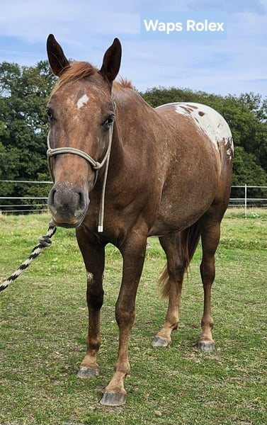 Zum Verkauf steht der bildhübsche Appaloosa-Wallach Waps Rolex, direkt vom Züchter, mit hervorragendem Charakter und viel Potenzial für Sport und Freizeit. Appaloosa Wallach, geb. 03.09.2021, ca. 160 cm, Farbe: liver chestnut with blanket. Er überzeugt durch ein korrektes, harmonisches Gebäude, ein solides Fundament mit starken Knochen und guten Hufen, läuft barhuf und ist ausgewogen bemuskelt. Seine weichen und angenehmen Grundgangarten machen das Reiten besonders komfortabel. Waps Rolex ist sehr menschenbezogen, ruhig und brav im Umgang, dabei verspielt und stets interessiert an dem, was sein Besitzer macht. Er möchte immer gefallen, lernt schnell und bringt ein ausgeglichenes, angenehmes Temperament mit. Er wuchs im Herdenverband auf, ist dort mittelrangig und sozial gut integriert. Verladen ist für ihn kein Problem, Tierarzt und Hufschmied kennt er selbstverständlich. Der Wallach besitzt eine gute Westernausbildung und wird aktuell vom Profi weiter in Richtung Ranch Riding gefördert. Die meiste Zeit seiner Ausbildung verbrachte er im Gelände und kennt das Reiten an unterschiedlichen Orten wie z.B. Strand. Unter dem Sattel zeigt er sich sehr zuverlässig, mit Talent insbesondere für Ranch-Klassen, ist aber ebenso als vielseitiger Freizeitpartner geeignet. Gesund, regelmäßig geimpft und entwurmt, dem Zahnarzt regelmäßig vorgestellt und 5-Panel n/n. Die ApHC-Papiere liegen vor. Ob als zukünftiges Showpferd oder als zuverlässiger Freizeitpartner - mit seinem goldenen Charakter und seiner guten Abstammung ist dieser Youngster ein echtes Versprechen für die Zukunft.