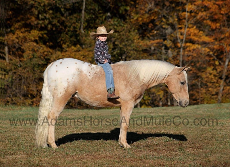 Go to visit our website for more pics and a video. AHAMC has been in the horse business and sold horses over the internet since 2005. We have a long track record of success with hundreds of happy customers. We work hard to match riders with the correct horses and specialize in beginner safe, family friendly horses that have been used and checked out by our family! Trash those X-Boxes, Playstations or other video game consoles, kids don’t need to be glued to a TV… Kids need a horse like Pecos Bill!!! Take a look at the coolest little appaloosa horse that you will see! He has it all going for him from that beautiful palomino color, to that pretty LONG mane and tail and don’t forget about that sweet little lope! Pecos Bill is a 5 year old gelding that is standing around 13.3hh. All fall and winter long Pecos Bill has been one of our 6 year old daughters horse and she has trail ridden him, took him camping, had around the ranch and pushed cows with him. Pecos Bill has been the perfect horse for her! Pecos Bill is plenty stout enough to carry an adult as Mom has taken Pecos Bill out on the ranch, where she has pasture roped and doctored sick ones, herded cattle and the kids have ridden down the trails almost daily! Pecos Bill will cross creeks, ditches, logs and navigate rough rocky areas. He has a nice walk, smooth jog, a good slow lope, he reins around and backs as well! He has been exposed to all kinds of wildlife and will go anywhere that he is asked too. He has been ridden many miles in the mountains of Eastern Kentucky and encountered every obstacle possible on the trail. He will go up or down even the steepest slopes, across deep creeks, over downed trees, and over all types of rough terrain while still being sure footed. Pecos Bill will be a family favorite for years to come! Call 606-308-2461 for more info.