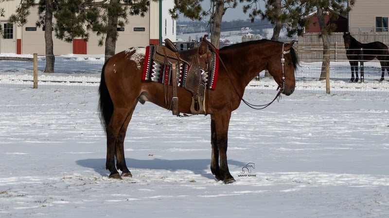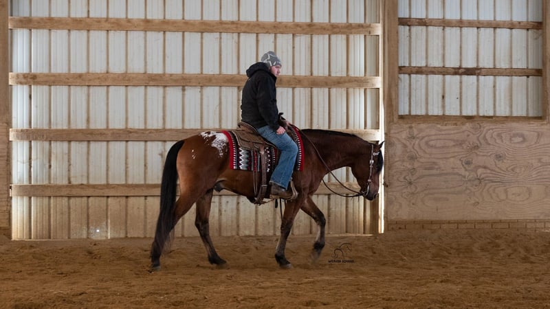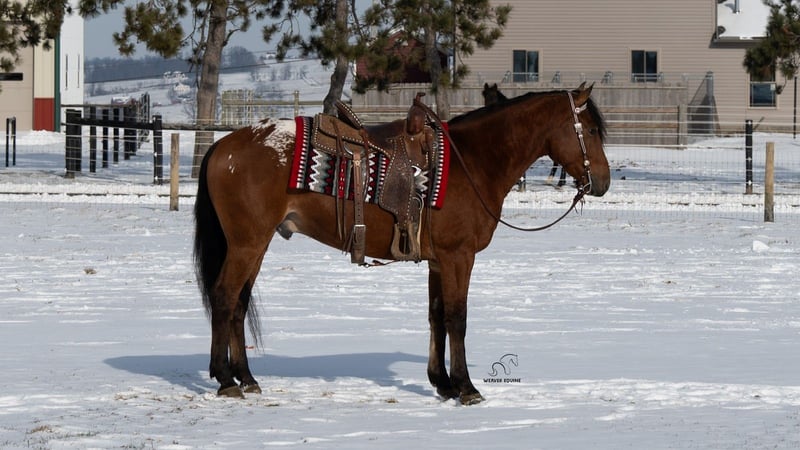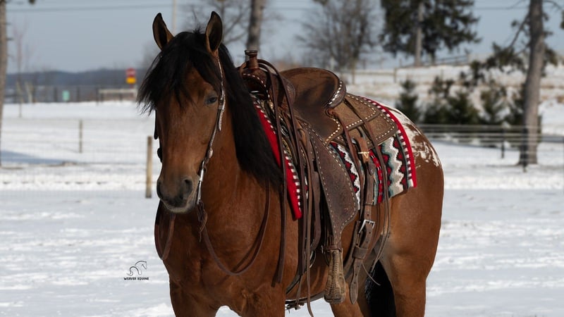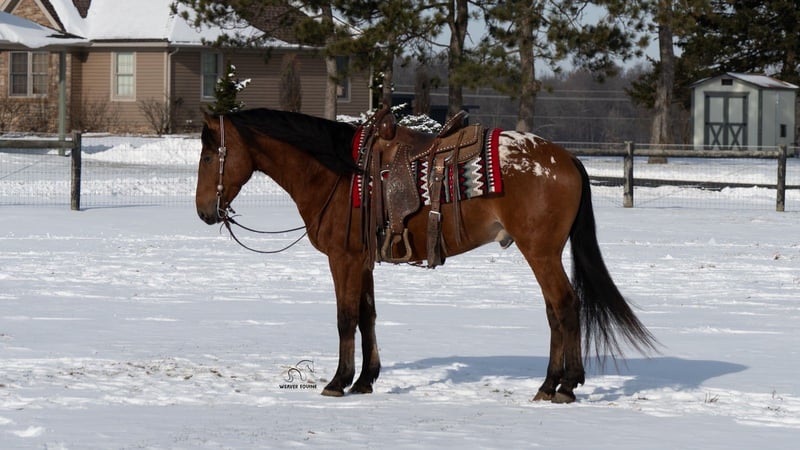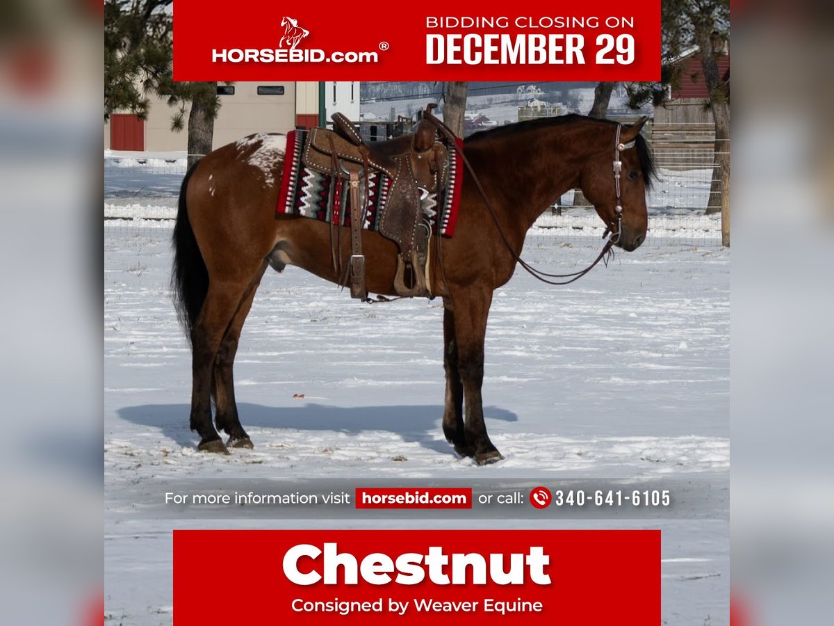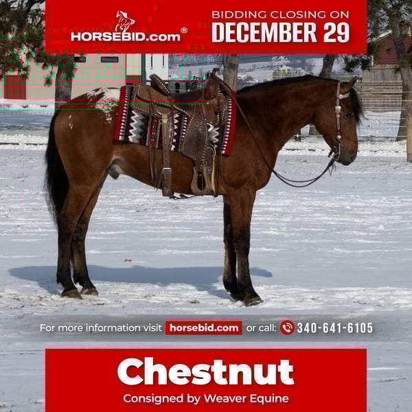 ⚜️ 𝓗𝓮𝓻𝓲𝓽𝓪𝓰𝓮 𝐖𝐢𝐧𝐭𝐞𝐫 𝓒𝓵𝓪𝓼𝓼𝓲𝓬⚜️ Happening now thru MONDAY | DECEMBER 29th - Available EXCLUSIVELY on HorseBid's website! For more details and to register visit: www.Horsebid.com CONSIGNOR CONTACT: Weaver Equine 340-641-6105 LOCATION: Fredericksburg, OH BREED: Appaloosa/ Friesian/QH Cross REGISTERED: No COLOR: Bay HEIGHT: 15.2 AGE: 5 GENDER: Gelding Chestnut. Introducing a very unique colored Gelding with all the qualities. Chestnut is 5 years old and very well broke to ride. He is super handy to have around. He will neck rein and sidepass easily. He will ride well in the arena and outside. He will lope a circle nicely. He picks up both leads correctly. He has a super willing attitude and aims to please. He will stand at a mounting block. He will stop and back up nicely when asked. He has been ridden under both English and Western disciplines. He does not mind a tarp or flag. He has been ridden outside in the snow, on the roads, and on the trails. He will stop and stand nicely at the stop signs. He does not mind riding alone or with a group. He is super easy to handle on the ground. He will lead nicely. He will ground tie and also stands well in the cross ties. He does not mind being bathed. He will stand well to be tacked and groomed. He will stand well for the farrier. He picks up all four feet. He is easy to catch in the stall. He will bridle nicely. He does great when turned out with other horses. He does not mind trailer loading. Chestnut is a super easy keeper with a friendly attitude. No maintenance required. 100% sound. Feel free to reach out with any further questions, we look forward to hearing from you!
