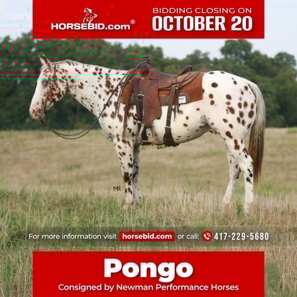 ♦️ 𝐭𝐡𝐞 𝐀𝐌𝐄𝐑𝐈𝐂𝐀𝐍 𝓕𝓪𝓵𝓵 𝓒𝓵𝓪𝓼𝓼𝓲𝓬 ♦️ Happening now thru MONDAY | OCTOBER 20th - Available EXCLUSIVELY on HorseBid's website! For more details and to register visit: www.Horsebid.com CONSIGNOR CONTACT: Newman Performance Horses 417-229-5680 LOCATION: Verona, MO BREED: Appaloosa REGISTERED: No COLOR: Leopard Appaloosa HEIGHT: 15 AGE: 7 GENDER: Gelding If you’re looking for a horse that will turn heads everywhere you go, look no further! This handsome blue eyed boy stands 15 hands and is just 7 years old, making him the perfect age to enjoy for many years to come. With his unique spotted coat, and gentle disposition he is always the center of attention and loves all the affection he gets. Pongo is gentle enough for a variety of riders and is always eager to please. He is sure footed and handles trail obstacles with ease, has been used outside gathering pairs to move pastures. This versatile gelding is skilled both in and out of the arena. Pongo is easy to keep, has great feet, easy to shoe, will be the first to greet you at the gate, and is just a true unicorn!