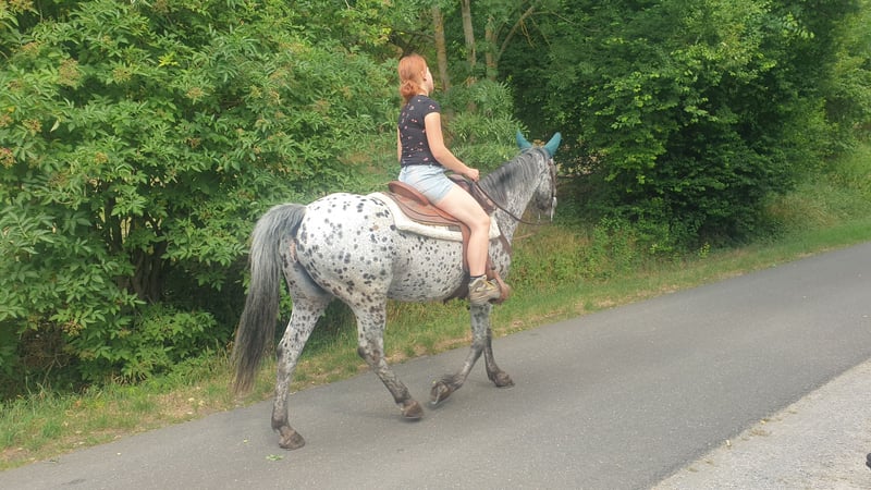 Kates a Star, surnommée Kati, est une descendante de "Toby 1", provenant donc de la célèbre lignée Toby. Elle a été montée pendant la période où elle n'était pas pleine et n'avait pas de poulain à ses côtés. Kate est une excellente mère et est à nouveau pleine de Buns Final Chief. Son dernier poulain (voir les photos) est un Buckskin ; avant cela, elle a eu un Schabrackentiger et encore avant, un Tigerschecke. Elle transmet donc - selon le cheval de reproduction - des couleurs variées. Elle a des pieds très sains, est ferrée et chargée sans problème, et est très agréable à manipuler. D'après mon expérience en travail au sol avec elle, je peux dire qu'elle est intelligente, apprend rapidement et est coopérative. Je dois me séparer d'elle pour des raisons d'âge et de santé et je ne la confierai qu'à un bon endroit. Kate n'a jamais eu de problèmes depuis qu'elle est avec moi ; cela s'applique également à son poulinage et à ses poulains (je peux fournir un contact avec son vétérinaire).