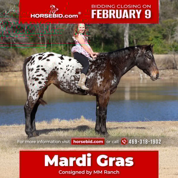 ❤️🔥𝑩𝒆 𝑴𝒊𝒏𝒆 𝐒𝐄𝐋𝐄𝐂𝐓❤️🔥 Happening now thru MONDAY | FEBRUARY 9th - Available EXCLUSIVELY on HorseBid's website! For more details and to register visit: www.Horsebid.com ONSIGNOR CONTACT: MM Ranch 469-318-1902 LOCATION: Forney, TX BREED: Appaloosa REGISTERED: No REGISTERED NAME: Mardi Gras COLOR: Leopard Appaloosa HEIGHT: 15 AGE: 14 GENDER: Mare 🪗🥁📿Mardi Gras!! 🪇🎷🎭 Highlights : -flashy leopard appaloosa -bombproof -safe for anyone to ride -babysitter type -beginner safe -no bad habits -no maintenance -no heath problems Wow is best way I know to describe this girl. She is spotted from head to tail. She is the kind you don’t see everyday. She is just 14 yrs old and stands 15 hands tall. A true leopard Appaloosa. If you want to stand out from the crowd Mardi Gras is the way to go. 🐆 She is just as gentle and sweet as she is glamorous!! This mare is the true definition of gentle, safe, well-mannered, in your pocket, and is an absolute sweetheart!! Whether you’re looking for a horse for the whole family to hit the trails, a solid broke mount to go do a days work on, or a smooth ride to play around in the arena Mardi Gras is your girl!!! She has been used on a ranch, making her very experienced and versatile mount! She’s great if rode once a week, once a month or even once every 6 months! She doesn’t get fresh. No tune up required. She’s the kind you can just jump on and go! Mardi Gras will go absolutely anywhere you point her, through rough rocky country, steep slippery slopes, thick brush, flowing waters, busy streets of town, you name it and she will go on through it without batting an eye and surefooted as can be! Cruise on down the trail with ease!! She is not only great to ride outside, she’s an absolute blast in the arena as well! She will walk, trot, and lope both ways with ease. Smoothly picks up both her leads, neck rein and has a good stop! Mardi Gras would be a great fit whether you’re 3 years old or 93 years old, a beginner rider or an experienced rider. She has absolutely no buck or bad habits. 🎨 She did have a pre vet evaluation done included in the pictures. She sells absolutely sound. Sound to bred as well if you want to do that with her. She has no maintenance or special requirements. No special feed. She is a super easy keeper. If you have anymore questions about her feel free to call to us. We would love to visit with you about her. We can help you arrange shipping anywhere. She is up to date on all vaccinations, worming, had her teeth checked, feet. She is ready to go to her new home to be loved and enjoyed. Don’t miss out on this girl!!