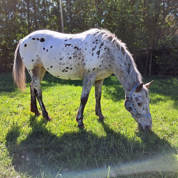 Vente en mandat : Nelly, une jument Appaloosa très douce de 16 ans, environ 1,55 m. Elle est idéale pour les enfants et connaît tout ce qu’un excellent cheval de loisir doit savoir. Que ce soit en promenade seule ou en groupe, en forêt, à la plage ou en ville, Nelly prend beaucoup de plaisir à sortir et se montre également très agréable à monter en manège ou en carrière, que ce soit avec un pad, une selle western, une selle anglaise ou même sans selle. Malheureusement, nous n’avons plus suffisamment de temps pour cette adorable petite. Aucun problème de santé connu. Nelly n’a pas de certificat de santé (TÜV), mais il peut être réalisé sur demande de l’acheteur. Elle serait également adaptée à l’enseignement et se montre très calme en main. Si vous êtes intéressé, veuillez nous contacter. Prix sur demande, à partir de 4500 euros. Une séance d’essai coûte 30 euros, qui sera déduite du prix d’achat si la vente se concrétise.