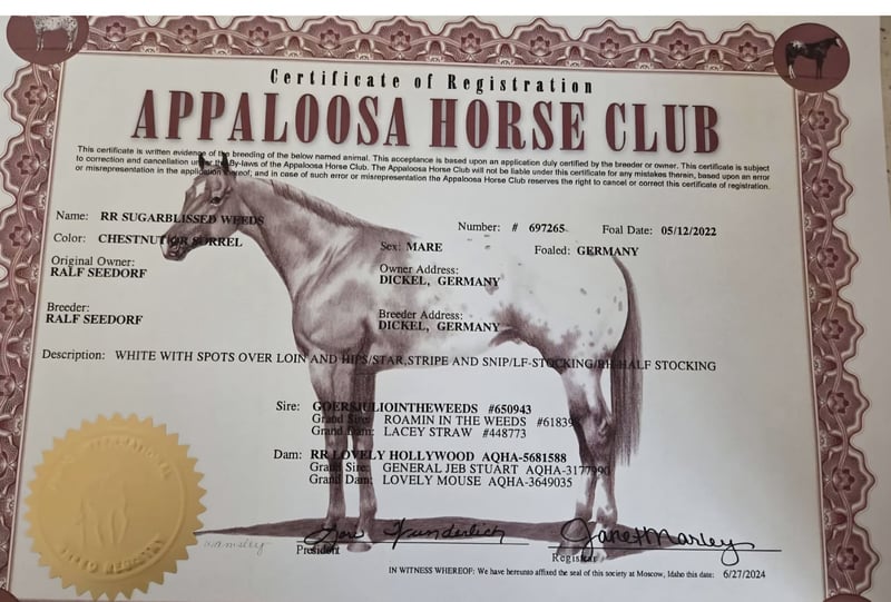 Appaloosa Mare "Sugar" Looking for a Loving Home 🐴 We are seeking a caring and nurturing home for our charming Sugar, where she will be appreciated, supported, and well cared for. Sugar is already familiar with basic foal handling, is well-behaved with the farrier and veterinarian, and consistently shows a calm and uncomplicated demeanor in daily interactions. She has been gently lunged and impresses with her eagerness to learn and her desire to do everything correctly. She is raised in an open stable in a group with other young horses, ensuring she is well-socialized. In handling, she is very cooperative: she stands quietly at the cross-ties, allows grooming without fuss, and gives her hooves easily. Her personality is particularly characterized by her friendly nature—she enjoys human attention and loves being brushed and cuddled. She is regularly dewormed and fully vaccinated. In addition to her equine passport, she also possesses American registration papers (see pictures). Sugar is suitable for Western riding, breeding, or leisure activities. Her excellent pedigree makes her especially interesting. If we have sparked your interest, we look forward to hearing from you. We are happy to answer any questions and arrange a meeting by appointment at your convenience. Currently 16.1 hh Lp/lp Price on request. Reasonable offers will be considered.