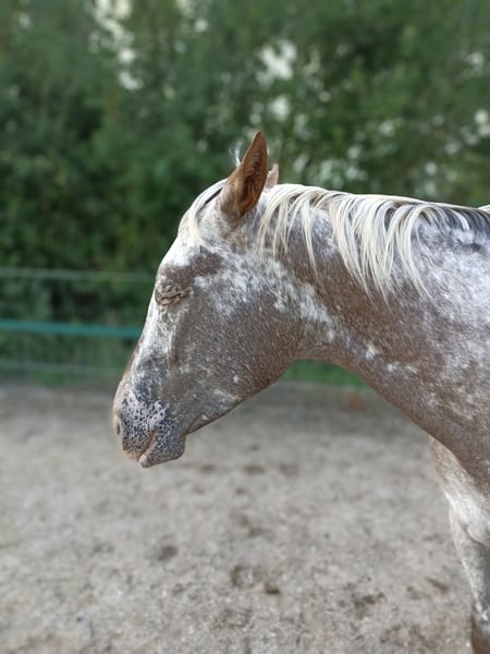 A very gentle and calm Appaloosa mare. She has a sweet character when interacting with people and does not display mare-like behavior within the herd. She is well-behaved and calm on outdoor rides. She has an aptitude for cutting and also enjoys groundwork sessions. She possesses ground skills under saddle. If genuinely interested, more information can be provided.