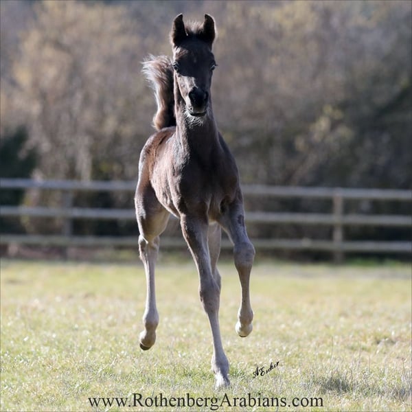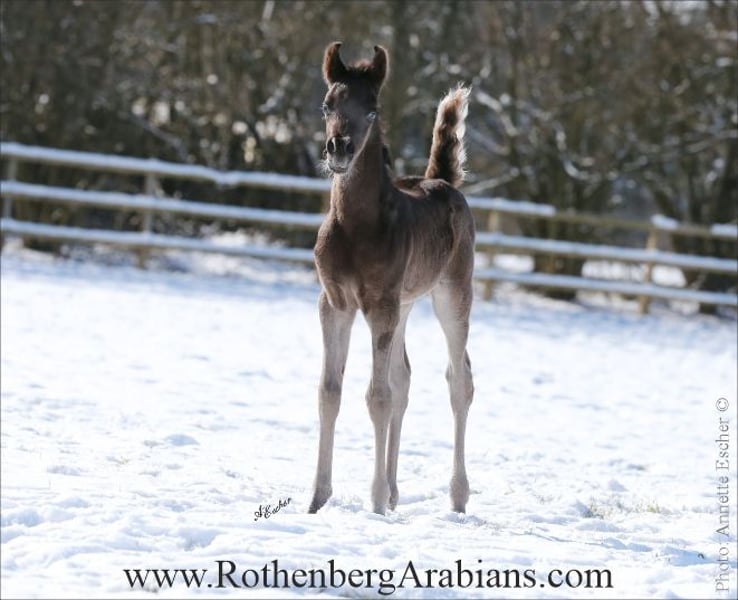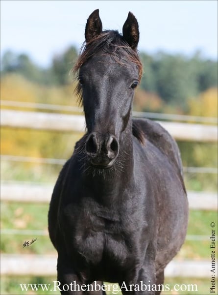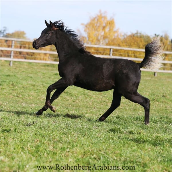 Super exotic typey black Straight Egyptian colt in gorgeous all overall quality for breeding & show! By our black Gold-premium stallion GR Ishad (by black Gold-premium stallion GR Nashad exp. Kuwait x Shaylah Bint Iman by Multi-Champion Classic Shadwan) out of a daughter of black Gold-premium stallion Maheeb! Motherline goes back to our foundation-mare Samara Bint Moheba out of the famous Salha line from EAO! Outstandig proven Straight Egyptian pedigree, exotic typey face, perfect in body, topline and legs and additional fantastic super showy movements - just and outstanding black colt! Father and both grandfathers are black Gold premium stallions of the German Registry, nearly impossible to find! Additional sale-horses on request! For more information please have a look at our homepage www.RothenbergArabians.com or send an e-mail! Please also visit us at Instagram: #RothenbergArabianStud