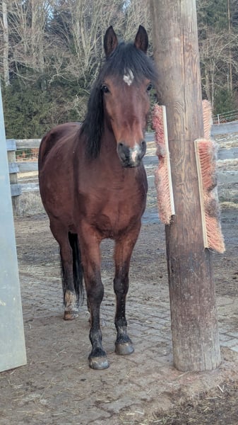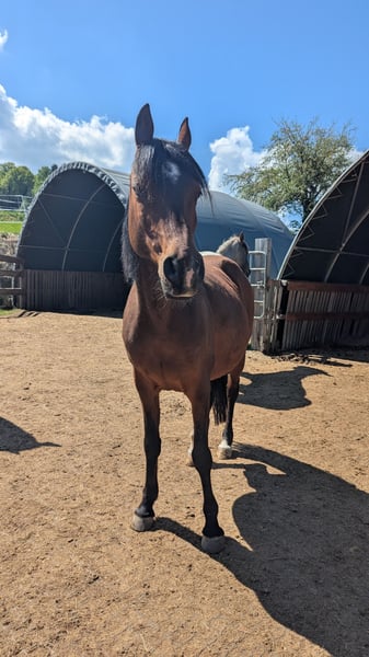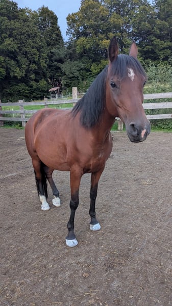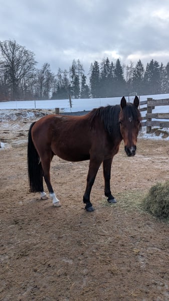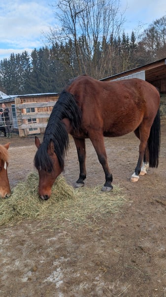 We took him over last year after his horse companion unfortunately passed away. He was kept in a paddock for a long time and now needs groundwork and trust-building. We've already achieved a lot with him, but he is not suitable for beginners. I have also ridden him in the arena before; he was well-behaved and tended to stand rather than rush forward. Unfortunately, due to health reasons, I simply don't have the time to work with him regularly. He has been ridden both English and Western. He is currently kept in a pasture with a mixed herd. He is regularly vaccinated and dewormed. We are including his English saddle with the horse. If someone is not looking for an immediate riding horse but is willing to give him the time to develop a bond, he will surely make a good partner.
