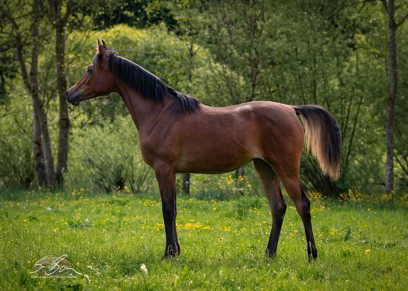 Rajiyyah is a stunning, typy, correctly conformed pure Egyptian filly with a gentle, human-oriented character and an exceptionally interesting pedigree for breeding. She is absolutely well-built, with solid foundations, a strong body, and a very good topline. Her refined, typy, dry face features large, expressive, dark eyes and a delicate muzzle. Her head flows into a fine neck that transitions smoothly into a well-shaped, elegant neck. Her powerful body, with well-angulated shoulders and pelvis, and an excellent topline, stands on solid foundations with stable hooves. Her movements are expansive, elastic, and lively, with three well-defined basic gaits. She loves to show off and is very expressive. Rajiyyah has a sweet temperament, enjoys cuddling, and strives to please. She is intelligent, quick to learn, and eager to pick up new things. All these qualities make Rajiyyah very promising as a future broodmare and for shows. But she also has great potential as a riding horse for endurance and demanding leisure riding. She will be a reliable companion through thick and thin. Both her parents and other relatives are good riding horses. Rajiyyah is familiar with ground work, hoof care, trailer loading, children, cattle, cats, dogs, large machinery, road traffic, etc.—in short, everything a young horse should know. She grew up in a herd and is therefore very well socialized.