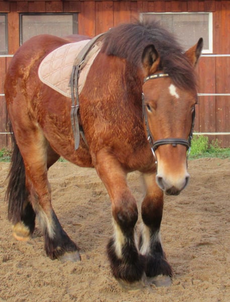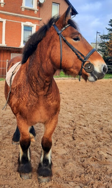 Ardennes mare with a heart of gold—friendly, laid-back, affectionate, well-built, and soon ready to start her training. Full papers. Travels well in the trailer and stands calmly alone. She is familiar with a turnout blanket, girth, dogs, and tractors. She stands nicely tied. Currently approximately 15.5 hands, quite stocky, with an expected final height of around 16.0 hands.