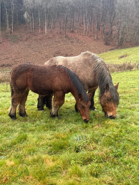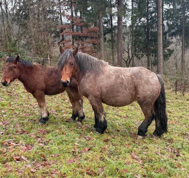 For sale is a 4-year-old (born May 2021) Ardennes mare, approximately 150 cm tall, with a beautiful coat and a strong build. She has previously foaled and is currently in foal again for 2026. A breeding license is available. She has an excellent and full pedigree. She is very well-behaved in handling and could easily be used as a riding or driving horse soon. She has not been worked yet. Her temperament is calm and gentle, and she accepts handling and loading without issues. The small brown stallion is also for sale. No known health issues or allergies. An ultrasound examination can be performed upon request. Please feel free to call or send a message to 0157 36803742. All information is provided without guarantee. Prices are subject to change. Transport can be arranged, and online purchase is possible.