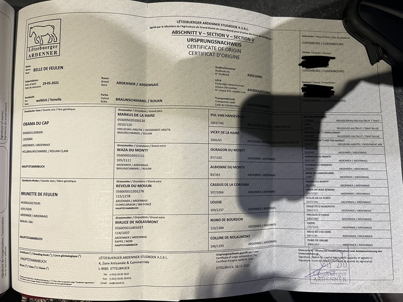 À vendre : une jument ardennaise de 4 ans (née en mai 2021), d'environ 150 cm au garrot, d’une belle robe et de construction robuste. Elle a déjà eu un poulain et est de nouveau gestante pour 2026. Un certificat de saillie est disponible. Elle possède naturellement une lignée complète et de qualité. Elle est très docile en main et pourrait facilement être utilisée comme cheval de selle ou de trait dans un avenir proche. Elle n’a pas encore été monté ni travaillé, mais possède un tempérament calme et tranquille, et accepte bien tout ce qu’on lui demande. Le chargement et autres manipulations ne posent aucun problème. Le petit étalon bai est également à vendre. Aucune maladie ou allergie n’est connue. Une échographie de contrôle peut être effectuée si souhaité. N’hésitez pas à appeler ou à envoyer un message au 0157 36803742. Toutes les informations sont données à titre indicatif, sous réserve de modifications, transport possible, achat en ligne également envisageable.