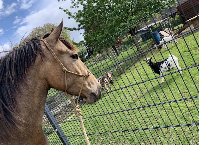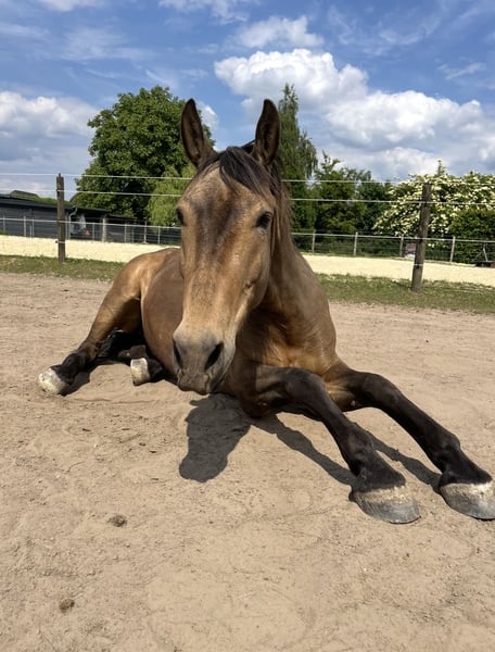 Met pijn in het hart moet ik mijn zielsgenoot verkopen. Omdat hij alleen in de allerbeste handen terechtkomt, vraag ik je het bericht zorgvuldig te lezen en alleen te reageren als je oprecht geïnteresseerd bent om hem als familielid, partner en vriend in je leven op te nemen. Turrón is een import-Spaanse (Conjunto Mestizo), in de prachtige kleur "Bayo", en staat inmiddels 5 jaar aan mijn zijde. Hij is over het algemeen zeer mensgericht. Hij bouwt echter vooral een sterke, bijzondere band op met zijn eigenaar en is daarom geen "familiepaard" of paard voor wisselende ruiters. Van karakter is hij gevoelig, speels, knuffelbaar, intelligent, dominant, nieuwsgierig en relaxed. Hij kan zeer fijn zijn in lichaamstaal, stemcommando’s en ruiterhulpen, maar probeert soms ook zijn eigen wil door te zetten. Daarom is een rustige, liefdevolle, consequente, zelfverzekerde en faire eigenaar belangrijk. Turrón houdt van afwisselende activiteiten. Hij geniet van grondwerk, equikinetiek, cirkeltraining, cavaletti, wandelingen, buitenritten enzovoort. Hij is een “coole peer” en voelt zich zowel alleen als in het gezelschap van andere paarden zeer op zijn gemak in het terrein. Hij wordt gereden in western vrijetijdsrijden, maar heeft ook ervaring opgedaan met handwerk en klassieke dressuur bij een instructrice (zijgangen, recentelijk ook renvers en travers in stap en draf, verlengen van passen in draf, halve passen op weg naar piaffe, en begonnen met de Spaanse stap onder het zadel) -> https://jennifer-pecat.de. Vanwege zijn ras is hij laat aangezet en met veel geduld getraind. Hij is zeer herdverträglich, heeft eerder met merries gestaan, maar voor zijn zenuwstelsel is een herde met alleen hengsten het beste. Sinds oktober woont hij in een privé openstal in Oberkrüchten, en ik zou het liefst willen dat hij daar kan blijven, omdat hij zich duidelijk thuis voelt. Het is een kleine, stabiele groep die hem veiligheid en rust biedt, en voorzien in zijn speels- en knuffelbehoefte. Een 6-sterren deluxe VP-stal – ook voor de mens. Voor hem zijn beweging en rustruimte belangrijk, net als de beperkte weidegang (2 uur per dag, bij zeer langzame inloop). Vanwege zijn afkomst kan hij slechts weinig gras eten en wordt hij volgens zijn mediterraanse stofwisseling gevoerd. Turrón loopt op blote voeten. Helaas is hij allergisch voor stro en pollen (hij krijgt momenteel loratadine tijdens het pollenseizoen). Tot nu toe hebben we geluk gehad – geen koliek, ernstige blessures of andere problemen. Hij is regelmatig gevaccineerd (tetanus, influenza) en ontwormd. Zijn tanden laat hij zelfs zonder sedatie braaf behandelen. Hij gaat probleemloos in de trailer en blijft tijdens het vervoer rustig. Turrón wordt inclusief toebehoren verkocht. Dit is van hoge kwaliteit (Rieser, Signum, Hilburry, etc.) en wordt met €1500 extra berekend. Een keuring (AKU) kan uiteraard door de geïnteresseerde bij een dierenarts naar keuze op locatie worden laten uitvoeren; de kosten hiervoor zijn voor rekening van de koper. Proefritten kosten €40, deze worden bij aankoop verrekend met de koopprijs. *Alle informatie is naar beste weten gegeven, aangezien het om een levend wezen gaat, zonder garantie.*